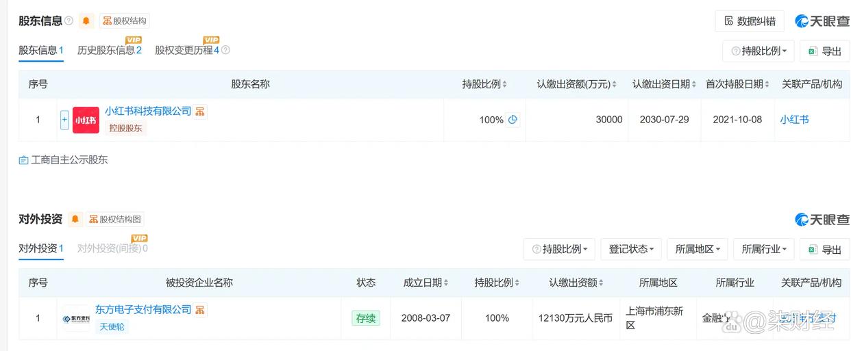 智通财经APP获悉,企查查APP显示,近日,支付机构东方电子支付有限公司(简称:东方支付)已由宁智信息科技(上海)有限公司100%控股。据悉,东方支 付支付牌照于2024年8月续展,获许开展互联网支付等业务。企查查信息显示,宁智信息为小红书科技有限公司旗下子公司,这意味着,小红书已获得支付 牌照。对此,小红书方面暂未作出回应。 | 股东信息 # 品股权结构 | | | | | | | | 园 数 | | --- | --- | --- | --- | --- | --- | --- | --- | --- | | 股东信息 1 | VIP VIP 历史股东信息2 股权变更历程42 | | | | | | | の持 | | 序号 | | 股东名称 | | | 持股比例 ÷ | 认缴出资额(万元) = | 认缴出资日期; 首次持股日 | | | 1 + 小红书 | 小红书科技有限公司 品 控股股东 | | | | 100% O | 30000 | 2030-07-29 | 2021-10- | | 白工商自主公示股东 | | | | | | | | | | 对外投资 ● 品股权结构图 | | | | | | | ...