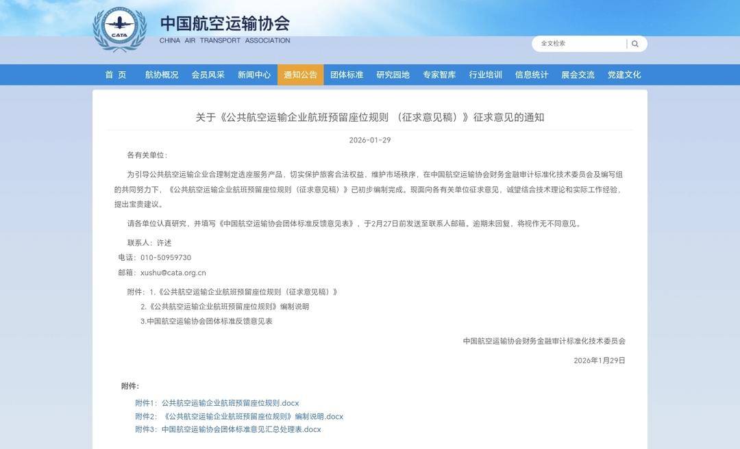根据《征求意见稿》内容,航空公司须将经济舱座位分为"免费可选座位"和"预留座位"两大类。其中: 此外,《征求意见稿》还提出要明确预留座位的释放时间,防止"最后一刻"才放座。航空公司须在网络 购票、值机等环节以显著方式告知旅客免费与预留座位范围、积分/里程兑换标准、付费选座价格(仅 限国际及地区航班)、预留座位释放时间等信息。同时,座位图需使用清晰图标区分"免费可选""会员 可选""线上不可选""已选座位"等类别,杜绝信息模糊与误导。 运行保障性预留座位需基于安全和服务刚性需求,包括安全员座位、紧急出口限制、特殊旅客 (如轮椅、担架、无陪儿童)保障等; 增值服务性预留座位分为权益类预留(积分/里程兑换)和付费预留(仅限国际及地区航班),明 确国内航班不得开展现金选座服务; 要求国内航班免费可选座位比例最低70%,国际及地区航班免费可选座位比例不低于65%。 据央视新闻报道,记者从中国航空运输协会了解到,为进一步引导航空公司规范航班预留座位行为,更 好满足旅客多样化、差异化的座位选择需求,中国航空运输协会组织各航空公司研究制定了《公共航空 运输企业航班预留座位规则(征求意见稿)》团体标准,今天向社会公布,并进行为 ...