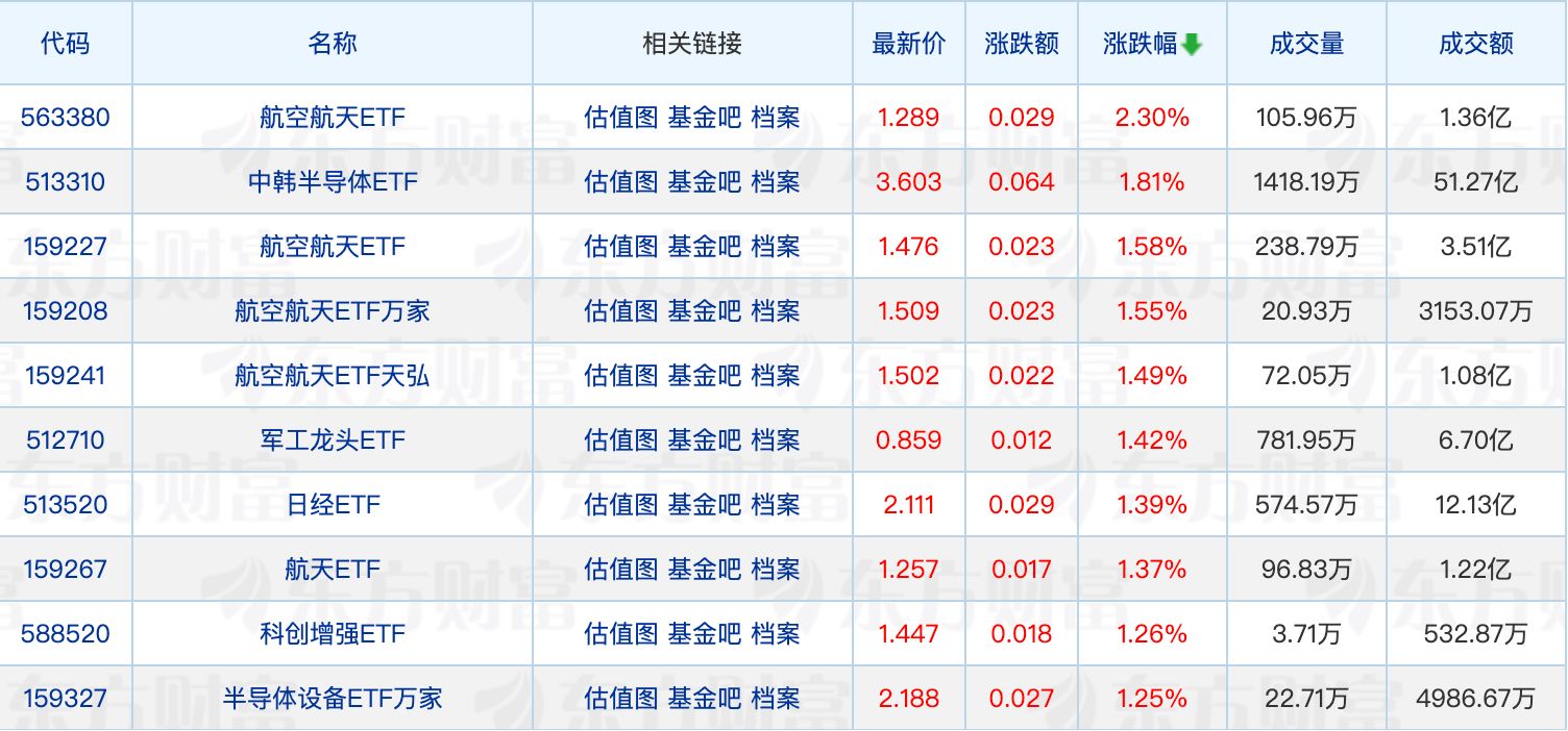 A股市场整体表现 - 三大指数全线下跌 上证指数下跌1.26% 深证成指下跌1.28% 创业板指下跌1.57% [1] 行业板块表现 - 船舶制造、航天航空、综合行业涨幅居前 [1] - 光伏设备、小金属、玻璃玻纤行业集体回调 [1] - 有色金属板块全线下挫 [1] ETF市场表现 - 航空航天板块ETF逆势上涨 华泰柏瑞基金航空航天ETF上涨2.3% 华夏基金航空航天ETF上涨1.58% [1] - 半导体板块ETF走强 华泰柏瑞基金中韩半导体ETF上涨1.8% 半导体设备ETF万家上涨1.25% [1] - 华夏基金日经ETF上涨1.39% 反映日股继续上涨 [1] - 原油相关ETF下跌 油气ETF博时下跌4.21% 石油ETF下跌3.99% [1] - 有色金属相关ETF下跌 有色ETF富国下跌3.73% 油气ETF汇添富下跌3.72% [1]
