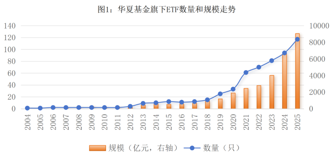 这一规模增长并非偶然。 2004 年,华夏基金发行境内首只 ETF (上证 50ETF , 510050 ),由此开启对 ETF 市场逾 20 年的持续深 耕,规模长期稳居境内行业首位。 二十多年来, 华夏基金致力于打造 境内 最为完善和领先的 ETF 产品图谱,为个人和机构客户提供一站式 ETF 产品配置服务,充分发挥 ETF 产品作为工具性投资产品的配置价值。 经过二十余年的深耕,华夏基金在 E TF 领域创造了多个 "最"。 一是规模最大,截至 11 月 19 日,华夏基金权益指数规模达 9047 亿元,在行业中位居榜首。它是境内唯一一家连续 8 年荣获"被动投资 金牛基金公司"称号的基金公司,也是唯一一家权益 ETF 年均规模连续 20 年稳居行业第一的基金公司。 近日,晨星( Morningstar ) 2025 年三季度全球前 20 大 ETF 提供商排名出炉,两家中国公募基金公司跻身全球前二十大 ETF 提供 商。其中,华夏基金的位次变化引人瞩目:截至 2025 年 Q3 ,旗下 ETF 管理规模达 1268 亿美元,排位从上一年的第 19 名,进一步提 高到第 18 名。自从其 2 022 年 ...