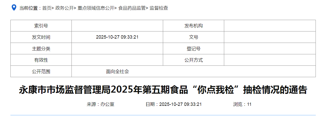 永康市市场监督管理局2025年第五期食品"你点我检"抽检情况的通告 近期,永康市市场监督管理局组织抽检餐饮食品、糕点、粮食加工品、食用油、油脂及其制品、乳制品等5类"你点我检"食品20批次样品。根据食品安全国 家标准检验和判定:抽样检验合格20批次。 欢迎广大消费者踊跃举报投诉不符合食品安全标准的食品,或根据自身消费经历,对疑似存在质量安全问题的食品提出抽检的具体建议。举报投诉电话: 12315。 永康市市场监督管理局 2025年10月24日 | 索引号 | | 发布机构 | | --- | --- | --- | | 发文时间 | 2025-10-27 09:33:21 | 文号 | | 主题分类 | | 登记号 | | 有效性 | | 公开方式 | | 公开范围 | 面向全社会 | | 永康市市场监督管理局2025年第五期食品"你点我检"抽检结果汇总表 | 序 | 型号 | 生产日期/购进 | 标称生产 | | | 检验 | | --- | --- | --- | --- | --- | --- | --- | | 样品名称 | | | | 抽样地点 | 检验机构 | | | 号 | 规格 | 日期 | ...