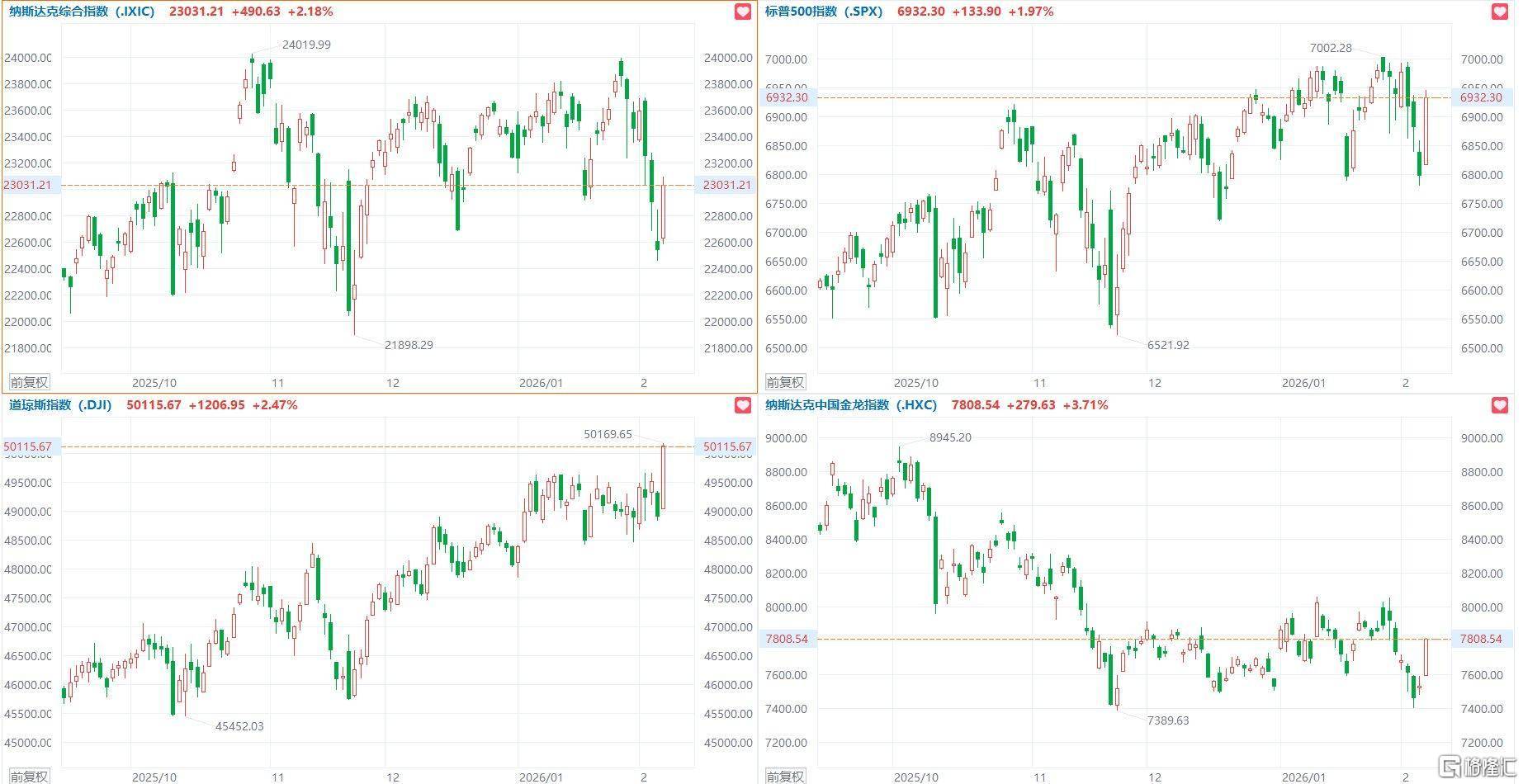 美股市场表现 - 2月7日美股大幅收高,道琼斯工业平均指数史上首次突破5万点大关,收盘涨2.47%至50115.67点,盘中最高触及50169.65点,纳指涨2.18%,标普500指数涨1.97% [1][2] - 市场出现板块轮动,投资者从成长股转向价值股,工业和金融板块表现突出,科技股在连续抛售后反弹,但标普500和纳斯达克指数本周仍受科技股抛售拖累下跌 [1] - 热门中概股普遍上涨,纳斯达克中国金龙指数收高3.71%,台积电涨5.53%,阿里巴巴涨3.00%,理想汽车涨6.63% [2] - 科技股回调之际,交易员追逐“抗AI”股票,住宅建造商、运输企业、重型机械制造商强劲上涨,必需消费品板块本周涨5.2%,迈向2022年以来最佳单周表现 [14] 重点公司动态 - **英伟达**:股价周五收高7.78%,结束五连跌,成交额达418.08亿美元,其CEO黄仁勋称科技行业为AI基础设施激增的6600亿美元资本支出合理且可持续,人工智能基础设施建设将持续7到8年 [1][8][9] - **亚马逊**:因一季度营业利润指引不及预期且宣布2026年资本支出规模超2000亿美元,股价收跌5.55%,早盘跌幅一度达10%,公司预计一季度营业利润165-215亿美元,低于分析师预期,并宣布裁员1.6万人 [1][11] - **特斯拉**:股价收高3.50%,公司正评估美国多地选址以扩大太阳能电池制造业务,支持马斯克建立100吉瓦国内太阳能产能的新愿景,目标在2028年底前在美国实现100GW太阳能制造能力 [1][8] - **诺和诺德**:周五股价反弹5.3%,但本周累计暴跌21%,录得六个月来最差单周表现,自2024年6月市值达峰值后,其市值已蒸发超过4500亿美元,跌出欧洲上市公司市值前十 [3][11] - **苹果**:计划开放CarPlay车载系统,允许第三方语音AI助手(如OpenAI、Anthropic PBC及谷歌的应用程序)使用,这标志着其车载战略的转变 [10] - **奈飞**:美国司法部在审查其拟收购华纳兄弟探索旗下资产的协议时,对其策略展开调查,询问是否存在反竞争或垄断行为 [9] 人工智能与科技行业 - AI基础设施概念股反弹,美光、闪迪、AMD、博通等均收高,全球多家大型科技公司财报公布庞大资本开支计划,引发投资者不安,几家企业总市值近几日合计跌近1万亿美元 [1] - 黄仁勋认为人工智能已为采用者带来回报,且不担心行业产能过剩,他表示“人类历史上最大规模的基础设施建设”由高计算能力需求驱动,能让企业获利 [8][9] - 美联储副主席杰斐逊指出,AI投资短期内或推升通胀,这与部分决策者认为AI能降通胀的看法不同 [6] 大宗商品与加密货币 - **比特币**:周五一度涨13%至71469美元,几乎收复周四全部失地,但本周累计跌幅仍超15%,周四暴跌是三年多来加密货币最剧烈的跌幅之一,较10月峰值累计下滑超50% [4][5] - **原油**:周五油价上涨,3月WTI原油期货涨0.4%至63.55美元/桶,4月布伦特原油期货涨0.7%至68.05美元/桶,投资者关注美伊在阿曼举行的高风险谈判,哈萨克斯坦本月石油出口或降35% [2][15] - **黄金**:现货黄金周五涨3.78%至4960.64美元/盎司,本周累计涨幅达1.37%,COMEX黄金期货涨1.96%至4985.10美元/盎司,本周累计涨幅为5.05% [3] - **白银**:现货白银价格周五反弹9.8% [16] 宏观经济与政策 - **美国消费者信贷**:12月未偿还消费者信贷总额增加240亿美元,创一年来最大增幅,超过经济学家预期,其中循环信贷(如信用卡)未偿还余额增加138亿美元,为两年多来最大月度增幅 [5] - **美联储政策**:副主席杰斐逊对2026年经济前景持“谨慎乐观”态度,预计经济增长略高于趋势,通胀将回归2%目标,旧金山联储总裁戴利认为劳动力市场存在脆弱性,可能需再降息一到两次 [6][13] - **美元与汇市**:彭博美元现货指数周五跌0.4%,因市场风险偏好回升、股市上涨,美元兑多数主要货币走软,美国财政部长贝森特反驳其与特朗普在美元政策上看法不同的说法 [6][18] - **反垄断调查**:白宫考虑对美国住宅建造商启动反垄断调查,潜在关注点之一是行业组织美国领先建筑商协会可能被用于限制住房供应或协同定价 [5] 其他行业与公司 - **欧洲股市**:斯托克欧洲600指数周五收盘涨0.9%,建筑、能源和银行股领涨,汽车股跌幅居前,Stellantis NV宣布相关费用后暴跌25% [3] - **贝莱德**:其全球固定收益首席投资官Rick Rieder正降低美国投资级和高收益债券敞口,增加新兴市场债券持仓,因其估值有利、美元偏弱,他管理着2.4万亿美元固收资产 [10] - **达能**:因欧盟降低婴幼儿食品中蜡样芽孢杆菌毒素含量限值,在荷兰召回部分批次诺优能品牌婴幼儿配方奶粉 [12]