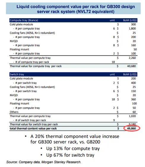 据科技媒体报道,摩根士丹利最新发布的报告显示,英伟达GB300 NVL72机架级AI系统,单单是液冷 散热组件的价值就高达49860美元(约合人民币近36万元),这已经比GB200 NVL72系统高了大约 20%。 报告还显示,下一代Vera Rubin NVL144平台的散热总价将更高,随着计算托架和交换机托架的冷却需 求进一步增加,预计每个机柜的冷却组件总价值将增长17%,达到约55710美元(约合人民币近40万 元),其中为交换机托架设计的冷却模块预计价值将显著增长67%。 | Compute tray (Bianca) | unit | BOM (USS) | | --- | --- | --- | | Cold plate module | ટે | 300 | | - # per compute tray | 6 5 | 1,800 | | Cooling fans (4056, N+1 redundant) | 5 | 25 | | - # per compute tray | 8 રે | 200 | | NVQD | 5 | 20 | | - # per compute tray | 8 5 ...