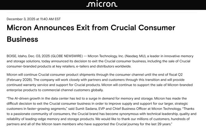 美光战略调整:退出消费级存储业务 - 美光科技宣布将全面退出旗下“Crucial”(英睿达)消费型存储业务,相关产品出货将持续至2026年2月,之后该业务线正式结束,从2026年3月起消费者将无法通过零售渠道购买Crucial品牌的内存条和固态硬盘 [1] - 退出原因是人工智能驱动的数据中心需求大幅攀升,公司需将产能和资源重新分配给利润更高、成长更快的企业级和超大规模客户,这是一个“艰难的决定” [4][5] - 美光计划通过将团队成员重新部署到公司内部现有空缺岗位来减轻业务决策的影响,现有产品的保修不受影响,公司将继续向全球商业渠道客户供应美光品牌的企业产品 [4][5] Crucial品牌历史与市场地位 - Crucial是美光科技旗下仅有的消费者品牌,也是首家直接向消费者销售内存的公司,核心业务涵盖台式机/笔记本内存条、消费级SSD、外置移动硬盘等零售类存储产品 [4] - 该品牌在历史上推动过多次技术升级,例如1999年率先推出DDR内存,2013年首发DDR4内存技术,2018年其P1系列SSD以2000MB/s的顺序读取速度刷新消费级SSD性能标准 [4] - 美光并未分开公布Crucial消费者业务的财务状况,但该公司上一季的云端内存部门营收年增了213% [4] 存储芯片市场涨价趋势 - 2025年下半年以来,全球存储芯片市场迎来显著涨价潮,DDR5内存2Gbx8颗粒现货价格自九月初至今大涨307%,DDR4 1Gbx8颗粒也有158%的涨幅 [6] - 具体产品价格飙升,例如英睿达经典款16GB DDR5台式机内存条在京东的售价从今年9月的329元涨至目前的999元,同规格的三星内存条也从500多元涨至近1300元 [6] - 存储产品价格翻倍上涨,进一步印证了企业用户加价抢购存储芯片的势头 [6] 资源转向高利润的HBM业务 - 退出消费市场后,美光将把更多资源用于HBM赛道,这类芯片价格远高于消费级存储器,通常能带来可观的利润 [6] - 美光已与英伟达和AMD签订了重要的HBM3E合同,并预计明年将推出HBM4样品 [7] - 上一财季美光的HBM产品收入增长至近20亿美元,相当于年化80亿美元的收入,HBM已成为美光核心利润来源 [7] 行业趋势与市场格局影响 - 美光的战略调整印证了半导体巨头因AI浪潮而重新调整策略的趋势,厂商将更多产能与资源优先投入高毛利的企业级市场 [8] - 在AI时代,消费级业务的利润率较低,其成长速度明显不及数据中心与服务器需求 [8] - 美光是全球第三大DRAM供应商,与三星和SK海力士合计占据DRAM市场92%的份额,在NAND闪存领域占据13%的市场份额,其退出将在消费级存储市场留下巨大空白 [8]