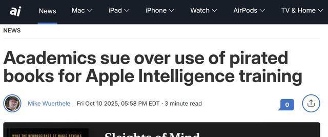 该案面临多重挑战:苹果未公开训练文档列表,举证存在难度;过往判例多认为海量数据逐一授权不具可行性。Anthropic案此前裁定训练属"合理使用"但存 储侵权,为本案提供复杂参考。 原告称,苹果未获授权便利用"Books3"影子图书馆的盗版内容训练AI,涉及其著作《幻觉冠军》与《思维的诡计》。证据显示,苹果2024年4月承认训练 OpenELM模型时使用的"The Pile"数据集,当时包含收录18万余本书的"Books3",且原告作品在列。虽"Books3"2023年10月因版权争议移除,但原告强调苹 果已完成复制与训练。 据科技媒体Appleinsider 10月10日报道,纽约州立大学健康科学大学的两名学术作者苏珊娜・马丁内斯-康德与斯蒂芬・麦克尼克,已对苹果公司提起集体诉 讼,指控其"苹果智能"(Apple Intelligence)AI系统训练使用含盗版作品的数据库。 原告要求陪审团审判、经济赔偿并禁售侵权成果。依美国版权法,若故意侵权成立,苹果每部作品最高需赔15万美元(约107万元人民币)。目前苹果未回 应此事。 ...