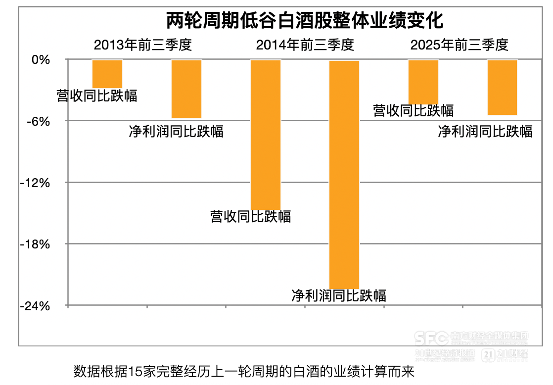 21世纪经济报道记者肖夏 抗跌能力变强了 首先需要说明,当前21家A股白酒上市公司中,完整经历上一轮调整期的,只有15家,分别是贵州茅台、山西汾酒、五粮液、洋河股份(002304)、泸州老 窖、古井贡酒(000596)、顺鑫农业(000860)、水井坊(600779)、舍得酒业(600702)、酒鬼酒(000799)、金种子酒(600199)、伊力特 (600197)、老白干酒(600559)、皇台酒业(000995)、天佑德酒(002646)。 而今世缘(603369)、迎驾贡酒(603198)、口子窖、金徽酒(603919),分别是在2014年、2015年、2016年上市。*ST岩石(600696)、*ST春天 (600381)是2019年、2020年半路跨界而来。 21世纪经济报道记者统计注意到, 对比核心业绩指标,完整经历上一轮调整期的酒企,整体抗跌能力是有所提升的。 2025年前三季度,这15家白酒的营收、归母净利润跌幅分别是4.5%、5.5%,而上一轮周期低谷的2013年、2014年同期,营收跌幅分别是2.9%、14.8%,归母 净利润跌幅是5.8%、22.5%。 2025年白酒三季报,是过去十年 ...