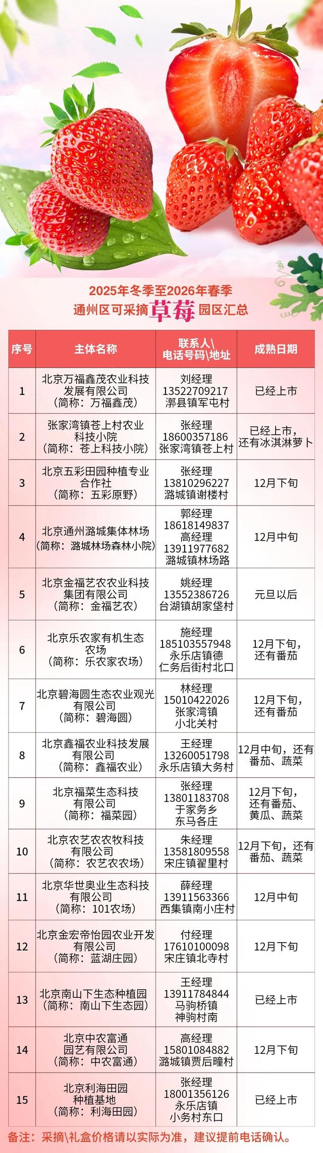 不如暂别城市喧嚣 转自:北京日报客户端 元旦假期怎么过? 带上家人朋友 走进通州的草莓园 亲手摘下 2026年的第一份甜蜜~ 在通州各大草莓园里 饱满多汁的草莓 早已缀满枝头 品相诱人 正值最佳风味~ 通州草莓采摘攻略 通州区可采摘 | 大 | 园区汇总 | 联系人 | | 序号 | 主体名称 | | 成熟日期 | | --- | --- | --- | --- | --- | --- | | 电话号码\地址 | | | | | | | 刘经理 | | | 北京万福鑫茂农业科技 | | | | 已经上市 | | 1 | 发展有限公司 | 13522709217 | | | (简称:万福鑫茂) | | | | 郭县镇军屯村 | | | 张经理 | | 2 | 张家湾镇苍上村农业 | | 已经上市, | | 科技小院 | | | | 18600357186 | 还有冰淇淋萝卜 | | (简称:苍上科技小院) | | | | 张家湾镇苍上村 | | | 张经理 | | 3 | 北京五彩田园种植专业 | | 12月下旬 | | 合作社 | | | | 13810296227 | | | (简称:五彩原野) | | | ...