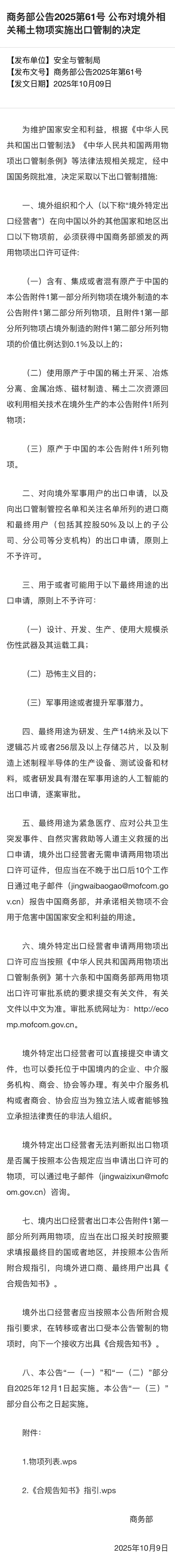 出口管制新规核心内容 - 商务部对含有中国成分的境外稀土相关物项实施出口管制,部分条款自12月1日起实施,原产于中国的物项即日起执行 [1] - 向境外军事用户、出口管制管控名单和关注名单所列进口商和最终用户的出口申请,原则上不予许可 [4] - 最终用途为研发、生产14纳米及以下逻辑芯片或256层及以上存储芯片及相关设备材料的出口申请,将逐案审批 [1][6] - 用于紧急医疗、公共卫生突发事件等人道主义救援的出口申请,可免于申请许可证,但需在出口后10个工作日内报告 [6] 受管制物项范围 - 含有原产于中国的物项且其价值占比达到0.1%及以上的境外制造物项需申请出口许可证 [3] - 使用中国稀土相关技术在境外生产的物项需申请出口许可证 [3] - 原产于中国的公告附件1所列物项需申请出口许可证 [3] 稀土的战略重要性 - 稀土被誉为“工业维生素”和“新材料之母”,是新能源、国防、高端制造等领域不可或缺的核心原材料 [11] - 在新能源领域,稀土磁材是电动汽车驱动电机、风力发电机等高端制造的核心部件 [11] - 在国防领域,稀土永磁材料用于制导系统、雷达和声呐设备,稀土涂层用于隐身战斗机以降低雷达探测概率 [13] - 稀土元素还广泛应用于LED照明、光纤通信、半导体抛光等高科技领域 [14] 中国稀土产业现状 - 中国稀土储量约4400万吨,占全球总储量的40%,重稀土储量占全球80%以上 [15] - 2023年中国稀土产量达21万吨,占全球近70%,冶炼分离产能占全球92.3% [15] - 中国稀土集团与北方稀土形成“双寡头”格局,控制国内85%开采指标和90%冶炼产能 [15] - 过去10年通过配额制度、出口关税等手段调控供给,2024年政策升级将进口稀土矿产品纳入配额管理 [16] 全球稀土市场格局 - 2023年全球稀土市场规模达数百亿美元,预计2025年将突破500亿美元,年均增长率超10% [18] - 中国拥有全球最完整的稀土产业链,在稀土分离提纯技术和高附加值产品生产上形成技术壁垒 [18] - 美国和欧盟高度依赖中国稀土供应,美国芒廷帕斯矿是主要来源但冶炼分离技术仍部分依赖中国 [19] - 澳大利亚莱纳斯公司是全球第二大稀土生产商,缅甸是重稀土主要来源但供应稳定性较差 [19] 未来发展趋势 - 中国需在技术创新、绿色转型和国际协作上持续发力,将稀土从“资源依赖”升级为“技术-金融-产业”复合型优势 [20] - 随着全球需求增长,中国需充分发挥优势,积极参与国际合作,在国际竞争中保持优势地位 [22]