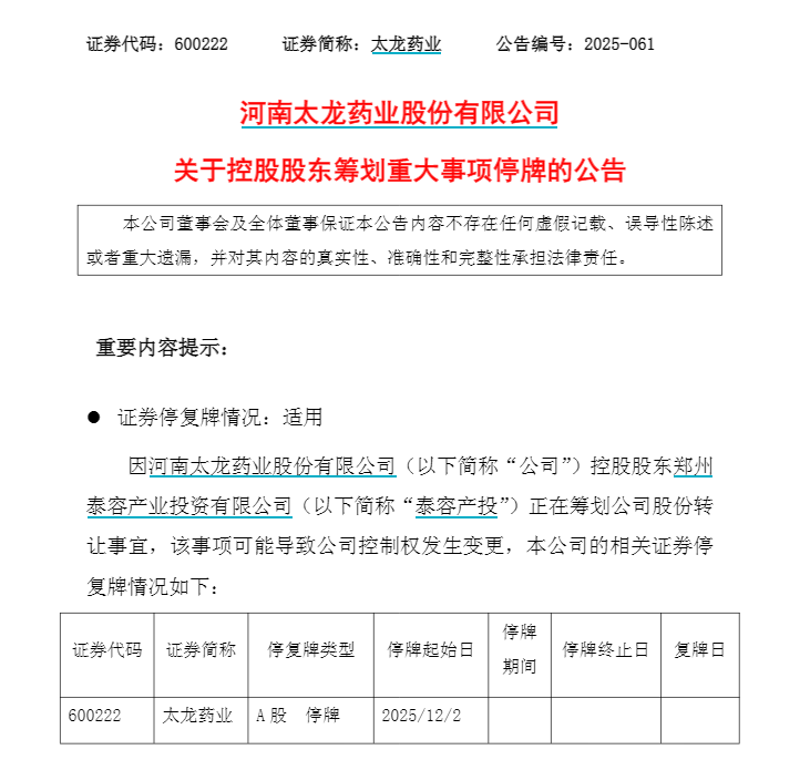 太龙药业(600222)明起停牌。 12月1日晚间,太龙药业(600222)发布公告称,公司控股股东郑州泰容产业投资有限公司正在筹划公司股份转让事宜,该事项可能导致公 司控制权发生变更。 行情数据显示,今年以来,太龙药业股价表现较为强势,累计涨幅接近70%,尤其在近两个月加速上涨,11月,公司股价累计涨幅接近 25%,今日(12月1日)盘中,公司股价一度触及涨停,截至收盘,涨6.72%,总市值49亿元。 业绩方面,公司三季报显示,今年前三季度,公司实现营业收入11.87亿元,同比减少11.47%;归母净利润2532.55万元,同比减少12.36%; 扣非后归母净利润2073.08万元,同比增长6.38%。今年三季度,公司实现营业收入4.24亿元,同比增长2.67%;归母净利润597.89万元,同比 增长162.48%。 | 证券代码 | 证券简称 | 信省理的 | | 停牌起始日 | 를 보 期间 | 停牌终止日 | 夏牌日 | | --- | --- | --- | --- | --- | --- | --- | --- | | 600222 | 太龙药业 | A BE | 信用 | 2025/12/2 | ...