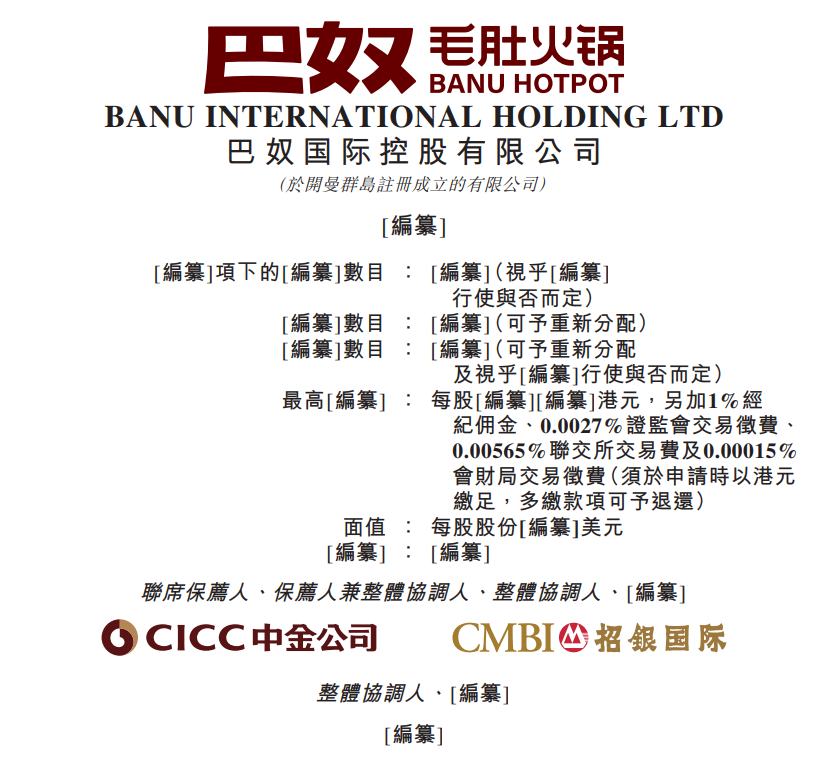 据港交所12月17日披露,巴奴国际控股有限公司(简称:巴奴毛肚火锅)向港交所主板递交上市申请,中金公司(601995)和招银国际为联席保荐人。该公司 曾于今年6月16日向港交所递交过上市申请。 | 【編纂】項下的[編纂]數目 : [編纂](視乎[編纂] | | | | --- | --- | --- | | 行使與否而定) | | | | [編纂]數目 | : | [編纂](可予重新分配) | | [編纂]數目 | | :「編纂」(可予重新分配 | | 及視乎[編纂]行使與否而定) | | | | 最高[編纂]:每股[編纂][編纂]港元,另加1%經 | | | | 紀佣金、0.0027%證監會交易徵費、 | | | | 0.00565%聯交所交易費及0.00015% | | | | 會財局交易徵費(須於申請時以港元 | | | | 繳足,多繳款項可予狠環) | | | | 面值 | : | 每股股份[編纂]美元 | 招股书显示,巴奴毛肚火锅是中国最大的品质火锅品牌,秉持产品主义经营理念,追求差异化市场定位。根据弗若斯特沙利文的资料,按收入计,巴奴是 2024年中国品质火锅市场最大品牌,市场份额约为3.1%,按 ...