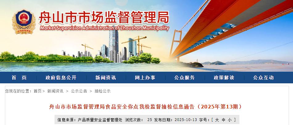 浙江省舟山市市场监督管理局食品安全你点我检监督抽检信息通告(2025年第13期)
