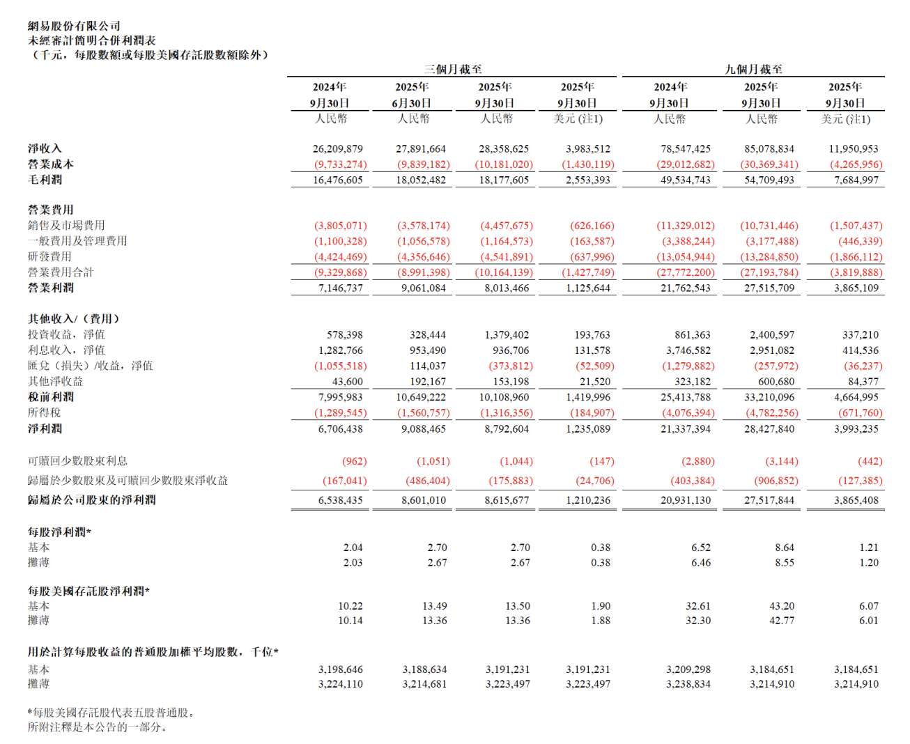 "不分散精力去做一些把握不大的新项目。"网易高层表示。 11月20日,网易(09999.HK)发布2025年第三季度财报。财报显示,网易Q3净收入284亿元,同比增加8.2%;归股净利润为86亿元,同比增长32%;非公认 会计准则下归股净利润为95亿元,同比增长26.7%。 | | 三個月截至 | | | | | 九個月7 | | --- | --- | --- | --- | --- | --- | --- | | | 2024年 | 2025年 | 2025年 | 2025年 | 2024年 | 2025 | | | 9月30日 | 6月30日 | 9月30日 | 9月30日 | 9月30日 | 9月3 | | | 人民幣 | 人民幣 | 人民幣 | 美元(注1) | 人民幣 | 人民 | | 浮收入 | 26,209,879 | 27,891,664 | 28.358.625 | 3,983,512 | 78.547.425 | 85,0 | | 營業成本 | (9,733,274) | (9,839,182) | (10,181,020) | (1,430,119) | (29,012,682) | ...