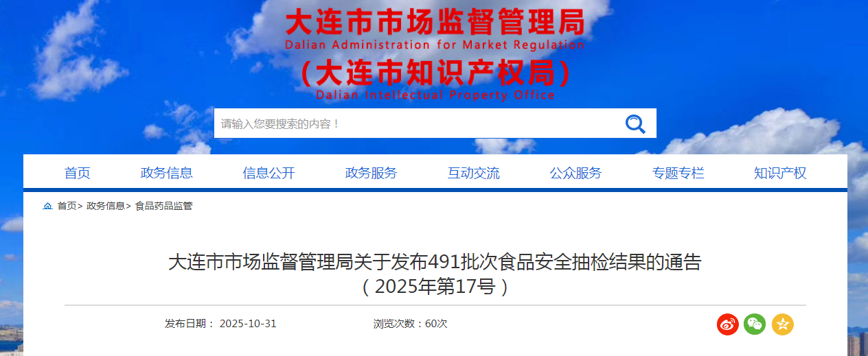 辽宁省大连市市场监督管理局关于发布491批次食品安全抽检结果的通告(2025年第17号)
