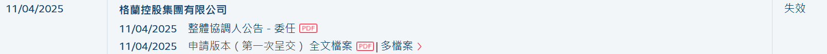 招股书显示,格兰控股是一家面向海外市场的成熟遮阳帘及遮光帘制造商,荷兰、英国、智利、法国及澳大利亚为其于往绩记录期间的主要销售国家。格兰 控股制造卷帘、柔纱帘、百褶帘、蜂巢帘、百叶帘以及配件销售予以自有品牌销售公司产品的国际客户,同时公司亦采购其他不属于其内部产品组合的遮阳 帘及遮光帘产品用于贸易销售予客户。 格兰控股集团有限公司(简称:格兰控股)于4月11日所递交的港股创业板招股书满6个月,于10月11日失效,递表时大华继显为独家保荐人,岭峰资本为其独 家财务顾问。 | | 11/04/2025 整體協調人公告 - 委任 歴 | | --- | --- | | 11/04/2025 | 格蘭控股集團有限公司 11/04/2025 申請版本(第一次呈交) 全文檔案 [四]多檔案 > | ...