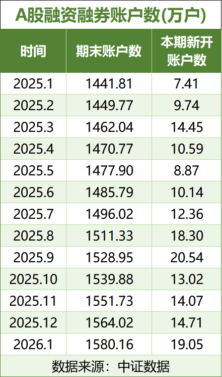 核心观点 - 2026年1月A股市场两融业务活跃度显著提升,新开户数与两融余额均创下历史新高,反映了市场情绪从谨慎转向积极 [1][2] - 市场上涨的赚钱效应、居民资产配置迁移带来的长期资金以及机构业务容量释放共同推动了1月两融市场的“开门红” [2][12] - 随着2月融资保证金比例上调新规落地,市场杠杆操作趋于谨慎,两融交易活跃度理性降温,增速放缓 [2][13] 两融市场整体表现 - 2026年1月市场新开两融账户19.05万户,环比增长29.50%,同比大幅增长157.09% [2][3] - 截至1月末,市场两融账户总数达1580.16万户 [3][5] - 2025年全年两融新开户数达154.21万户,创十年新高 [4] - 截至1月末,全市场两融余额报2.72万亿元,创历史新高,环比增长6.87% [2][6][8] - 1月全市场融资融券交易金额达6.40万亿元,其中融资买入金额6.37万亿元 [6] - 全市场担保物合计8.92万亿元,平均担保比例为289.38%,风险可控 [6] 市场情绪与资金驱动因素 - 年初A股主要指数全部上涨,科创50指数上涨12.29%,上证综指、深证成指分别累计上涨3.76%、5.03%,赚钱效应提振投资者风险偏好 [12] - 居民资产配置正经历历史性迁移,为杠杆工具使用提供基础,据测算2026年全年居民定期存款到期规模约达75万亿元 [12] - 2025年券商两融业务密集“提额”,至少8家券商调整了融资类业务规模上限,业务高增长态势在2026年初形成惯性释放 [12] 行业与交易结构 - 1月有色金属、电子和非银金融行业融资净买入额较多,建筑材料、轻工制造和美容护理行业融资净买入额较少 [7] - 截至2月4日,两融余额为2.69万亿元,两融交易额占A股交易额比重为9% [9] - 1月14日单日融资买入额达到历史峰值4508亿元,随后在融资新规影响下回落至3000亿元以下 [13][14] - 单日两融交易额占A股交易额比重也从11%以上逐步回落至9%-10%区间 [13] 政策影响与市场展望 - 1月19日起,融资保证金最低比例从80%提高至100%,此逆周期调节政策旨在为市场杠杆降温 [13] - 政策落地后,两融余额增速放缓、波动收窄,市场杠杆资金操作趋于谨慎 [2][13] - 步入2月,市场短期面临情绪降温和指数回调压力,两融市场或将进一步趋于平稳 [15]
