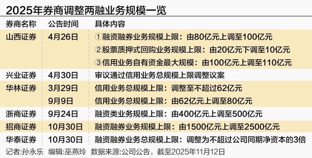 券商上调两融业务规模 - 招商证券董事会通过议案将融资融券业务规模上限由1500亿元增至2500亿元单次上调幅度达1000亿元 [1] - 华泰证券董事会同意将两融业务总规模上限调整为不超过同期净资本的3倍根据9月末净资本955.25亿元计算上限为不超过2865.75亿元 [1] - 除前述两家外华林证券山西证券兴业证券浙商证券也于年内上调两融及相关融资类业务规模上限其中华林证券年内两次上调信用业务总规模上限从62亿元提升至80亿元 [1][2] 市场信用交易需求与两融余额 - 自9月初两融余额首次突破2015年高位2.27万亿元后一路走高10月29日首次站上2.5万亿元刷新历史纪录截至11月5日收盘两融余额为2.49万亿元 [2] - 2025年1至9月A股市场两融日均余额1.94亿元同比增长超30% [2] - 券商两融收入普遍延续高增长例如国泰海通证券年内利息净收入合计52.08亿元同比增长超232%东方财富利息净收入增至24.1亿元同比增长60% [3] 业务调整的影响与行业趋势 - 券商调整两融业务规模上限有利于更好满足市场旺盛的资金需求吸引更多两融客户更多资金流入有助于提升市场信心和预期为股市带来上涨动力 [3] - 面对激烈市场竞争券商可通过科技赋能和综合金融服务优化业务流程提升服务质量吸引更多两融客户以提升自身差异化竞争能力 [4] - 券商两融业务是重要收入来源之一随着两融余额不断增加券商利差收入也水涨船高 [2]