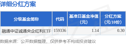 证券之星消息,10月20日发布《融通中证诚通央企红利交易型开放式指数证券投资基金第一次分红公 告》。本次分红为2025年度的第1次分红。公告显示,本次分红的收益分配基准日为10月10日,详细分 红方案如下: | 分级基金简称 | 代码 | 夏港日 夏会净值 | 分红方案 | | --- | --- | --- | --- | | | | (元) | (元/10份) | | 融通中证诚通央企红利ETF 159336 | | 1.14 | 0.30 | 本次分红对象为权益登记日下午深圳证券交易所交易结束后,在中国证券登记结算有限责任公司深圳分 公司登记在册的本基金全体基金份额持有人。,权益登记日为10月22日,现金红利发放日为10月24日。 本基金的收益分配采取现金分红的方式。根据财政部、国家税务总局相关规定,基金向投资者分配的基 金收益,暂免征收所得税。本基金本次分红免收分红手续费。 以上内容为证券之星据公开信息整理,由AI算法生成(网信算备310104345710301240019号),不构成 投资建议。 ...