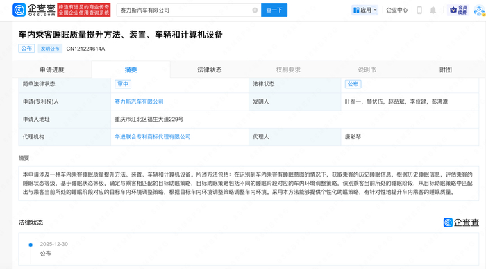 企查查APP显示,近日,赛力斯汽车有限公司申请的"车内乘客睡眠质量提升方法、装置、车辆和计算 机设备"专利公布。 摘要显示,本申请涉及一种车内乘客睡眠质量提升方法、装置、车辆和计算机设备。所述方法包括:在 识别到车内乘客有睡眠意图的情况下,获取乘客的历史睡眠信息,根据历史睡眠信息,评估乘客的睡眠 状态等级,基于睡眠状态等级,确定与乘客相匹配的目标助眠策略,目标助眠策略包括不同的睡眠阶段 对应的车内环境调整策略,识别乘客当前所处的睡眠阶段,从目标助眠策略中匹配出与乘客当前所处的 睡眠阶段对应的目标车内环境调整策略,根据目标车内环境调整策略调整车内环境。采用本方法能够提 供个性化助眠策略,有针对性地提升车内乘客的睡眠质量。 否 命造有远见的商业传奇 赛力斯汽车有限公司 全国企业信用查询系统 com J S200 车内乘客睡眠质量提升方法、装置、| 在识别到车内乘客有睡眠意图的情况下,获取乘客的历史睡眠 信息 公布 发明公布 CN121224614A / S400 申请进度 摘要 根据历史睡眠信息,评估乘客的睡眠状态等级 2025-12-30 公布 / S600 基于睡眠状态等级,确定与乘客相匹配的目标助眠策略,目 ...