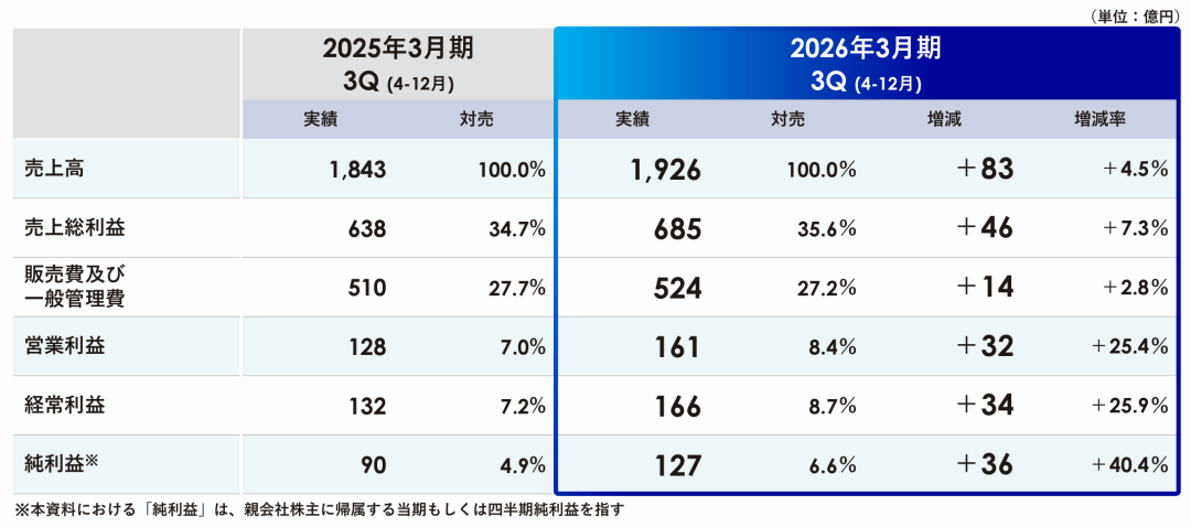 核心观点 - 公司2025财年前三财季(4-12月)销售额与净利润均创9个月历史新高,但预测第四财季因日本建筑新规影响,各项数据将面临显著下滑 [1][7][13] - 公司基于前三财季强劲表现上调了2025全财年业绩指引,但增长主要由前三季度驱动,第四季度预计将出现大幅负增长 [7][13] 财务业绩表现 (2025年4-12月) - **销售额**:实现1926亿日元(约合人民币85.98亿元),同比增长4.5%,创9个月历史新高 [1][2][8] - **营业利润**:实现161亿日元,同比增长25.4% [2][9] - **经常性利润**:实现166亿日元,同比增长25.9% [2][9] - **净利润**:实现127亿日元(约合人民币5.67亿元),同比增长40.4% [1][2][8] - **毛利率提升**:销售总利润率为35.6%,同比提升0.9个百分点 [3][9] - **费用控制**:销售及一般管理费用为524亿日元,同比增长2.8%,费用率从27.7%降至27.2% [3][9] 业绩增长驱动因素 - **新建渠道销售强劲**:前三财季新建渠道销售额达1251亿日元,同比增长6.6% [3][9] - **提价与政策刺激**:增长受益于产品价格上调,以及2025年4月日本建筑基准法修订前的需求提升 [3][9] - **成本与效率优化**:利润增长主要源于原材料成本压缩、库存减少带来的物流费用削减及生产效率提高 [3][9] - **改建渠道疲软**:改建渠道销售额595亿日元,行业普遍增长困难,但公司在9-12月销售额有恢复倾向 [4][10] 分业务板块表现 - **厨房业务**:销售额1173亿日元,同比增长4.9%,占总销售额60.9% [4][5][10] - **浴室业务**:销售额457亿日元,同比增长4.2%,占总销售额23.8% [4][10] - **浴室柜业务**:销售额230亿日元,同比增长8.1%,占总销售额12.0% [4][10] - **新业务**:玻璃熔块业务销售额19亿日元(+6.3%),装饰板材业务4亿日元(-14.3%),海外业务8亿日元(+2.9%) [6][11] 海外市场与运营布局 - **海外代理门店**:截至2025年12月底,海外代理店铺共75家 [6][12] - **中国大陆市场**:代理门店32家,9个月内新增2家 [1][6][12] - **中国台湾市场**:代理门店34家,9个月内新增2家 [6][12] - **越南市场**:代理门店4家,9个月内减少2家 [6][12] - **日本国内运营**:拥有15家工厂、8家物流中心及6560名员工 [6][12] 2025全财年业绩预测与展望 - **全财年预测上调**:预测2025财年(2025年4月-2026年3月)总销售额2510亿日元(约合人民币112.05亿元),同比增长3.1% [7][13] - **全财年利润预测**:预测营业利润178亿日元(+13.8%),经常性利润183亿日元(+14.3%),净利润136亿日元(约合人民币6.07亿元,+22.6%) [7][13] - **第四财季显著下滑**:预期第四财季(2026年1-3月)销售额下滑1.3%,营业利润下滑39.9%,经常性利润下滑41.0%,净利润下滑56.2% [7][13] - **下滑原因**:主要因日本建筑基准法修订可能导致新建独栋住宅工期延后,收入减少,同时改建市场增长困境预计持续 [7][13]