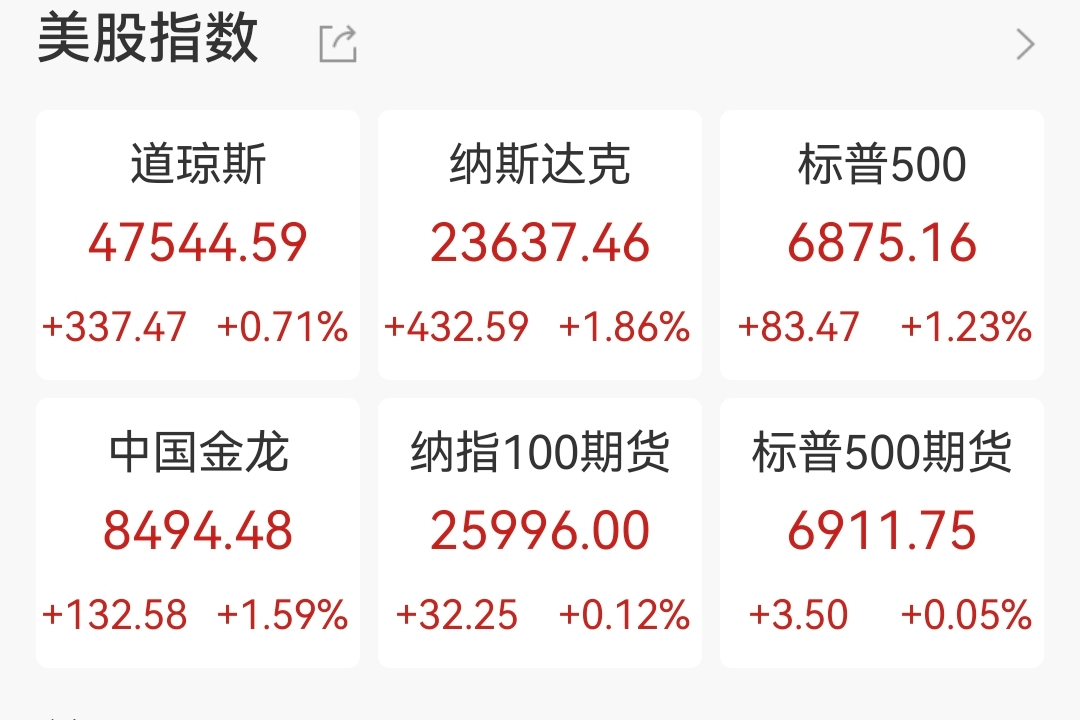 美国大型科技股集体上涨,美国科技七巨头指数上涨2.4%。个股方面,特斯拉涨超4%,谷歌、英伟达、苹果均涨超2%,其中谷歌、苹果股价再创新高, 苹果总市值逼近4万亿美元。 高通涨超11%,创2024年7月以来新高。消息面上,高通宣布,推出面向人工智能数据中心市场的芯片和计算机,旨在挑战英伟达公司。该公司的新款 AI200系列将于明年开始发货,首位客户是沙特阿拉伯的人工智能初创公司Humain。 当地时间10月27日,美国三大股指全线收涨,道指涨0.71%,标普500指数涨1.23%,纳指涨1.86%,均再创历史新高。 | 美股指数 | | | | --- | --- | --- | | 道琼斯 | 纳斯达克 | 标普500 | | 47544.59 | 23637.46 | 6875.16 | | +337.47 +0.71% +432.59 +1.86% +83.47 +1.23% | | | | 中国金龙 | 纳指100期货 | 标普500期货 | | 8494.48 | 25996.00 | 6911.75 | | +132.58 +1.59% +32.25 +0.12% +3.50 +0.05% | | ...