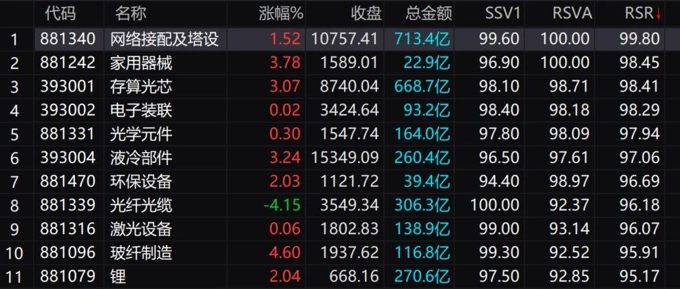 前天极度亢奋,仿佛又行了,不料昨天一片绿汪汪,是不是感觉天又要塌了。但忽如一夜春风来,今天再次满屏红艳艳。 韭菜的时空观只有一天的尺度,这是最致命的弱点。行为心理学上称之为近因效应,这是人类刻在基因中的反射密码,多数 人修十个轮回都无法突破。 光,带动了光模块、光芯片、光学元件、光纤、激光器; 大盘后面是逼空上行,还是回调以后再上行,这是无法预测的。我的判断就是会上去,而且还会创新高,至于怎么上去,不 重要。 聚焦,锚定主线,无论做短线还是波段,都不要脱离主线,牛市越到后期抱团越紧。 | | 代码 | 名称 | 涨幅% | 收盘 | 总金额 | ਟਨ NT | RSVA | RSR1 | | --- | --- | --- | --- | --- | --- | --- | --- | --- | | 1 | 881340 | 网络接配及塔设 | 1.52 | 10757.41 | 713.4亿 | 99.60 | 100.00 | 99.80 | | 2 | 881242 | 家用器械 | 3.78 | 1589.01 | 22.9亿 | 96.90 | 100.00 | 98.45 | | 3 | 393 ...