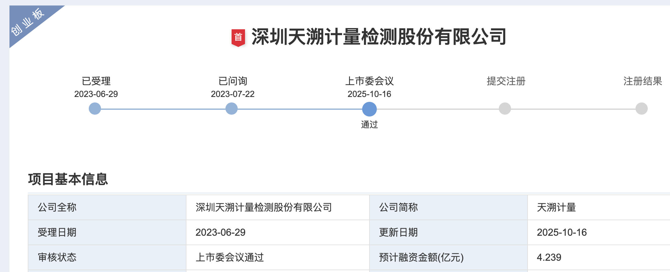 IPO审核结果 - 深圳天溯计量检测股份有限公司于2025年10月16日通过深交所创业板上市委员会审议,顺利过会 [1] 公司基本情况 - 公司成立于2009年,是一家全国性、综合型的独立第三方计量检测服务机构,主营业务为计量校准、检测、认证等专业技术服务 [3] - 公司是国家级高新技术企业、工业和信息化部“服务型制造示范平台”、“产业技术基础公共服务平台”、2024年广东省制造业单项冠军企业 [3] - 公司子公司广州天溯是广东省“专精特新”中小企业 [3] 业务能力与服务范围 - 截至2025年6月末,公司已发展完善几何量、热学、力学等十大计量校准领域及综合性专用测量仪器共计1417项校准服务 [3] - 公司已设立27个实验室关键场所,实现全国范围内市场区域“网格化”布局,是国内较少的几家全国性、综合型的独立第三方计量检测服务机构之一 [3] - 公司形成智慧计量实验室技术、生物医药产业计量校准技术等十二项核心技术,覆盖生物医药、高端装备、电子信息等多个下游领域 [4] 客户与市场地位 - 公司已与首钢集团、中国中铁、中国核工业、国家电网、中国铁建等知名集团企业建立了长期持续的合作关系 [3] - 公司存量客户保有率较高,主要客户群体较为稳定,各主要客户黏性较强,合作规模稳定 [3] 财务业绩表现 - 2023年至2025年上半年,公司营业收入分别为7.26亿元、8亿元、4.09亿元 [4] - 2023年至2025年上半年,公司归母净利润分别为1.01亿元、1.11亿元、5557.62万元 [4] - 公司营业收入和净利润均呈现出良好的增长态势 [4] 募投项目与资金用途 - 本次IPO计划募集资金4.24亿元,用于深圳总部计量检测能力提升项目、区域计量检测实验室建设项目、数字化中心建设项目、补充流动资金 [4] - 募投项目将有利于公司扩产增项,增强盈利能力,带来更多现金流,有助于扩大市场份额,实现规模化发展,助力全国实验室“网格化”布局的快速实现 [4]