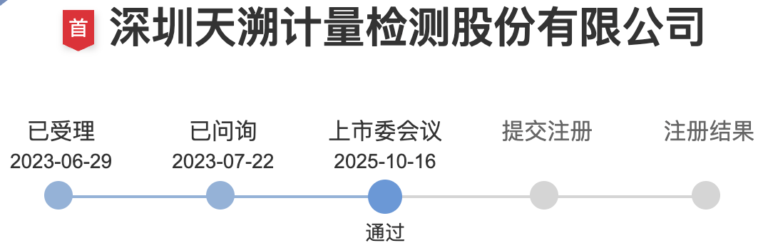 公司上市进展 - 深圳天溯计量检测股份有限公司创业板IPO于10月16日上会获得通过 [1] - 公司IPO申请于2023年6月29日获得受理,并于当年7月22日进入问询阶段 [1] 公司业务与募资用途 - 公司主营业务为计量校准、检测、认证等专业技术服务 [1] - 客户涉及生物医药、汽车、新能源、轨道交通、能源电力、轻工日化、装备制造等多个领域 [1] - 公司拟募集资金约4.24亿元,用于深圳总部计量检测能力提升项目、区域计量检测实验室建设项目、数字化中心建设项目及补充流动资金 [1] 监管关注要点 - 上市委要求公司结合技术先进性、证书单价下降、单位成本变化及行业竞争态势,说明销售费用率较高、研发投入强度较低的特点能否适应行业技术升级需求 [1] - 上市委关注公司业绩增长是否具有可持续性 [1]