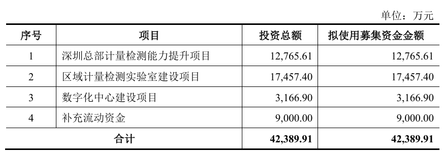 | 序号 | 项目 | 投资总额 | 拟使用募集资金金额 | | --- | --- | --- | --- | | 1 | 深圳总部计量检测能力提升项目 | 12,765.61 | 12,765.61 | | 2 | 区域计量检测实验室建设项目 | 17.457.40 | 17.457.40 | | 3 | 数字化中心建设项目 | 3.166.90 | 3,166.90 | | 4 | 补充流动资金 | 9,000.00 | 9.000.00 | | | 合计 | 42,389.91 | 42.389.91 | 招股书显示,天溯计量是一家全国性、综合型的独立第三方计量检测服务机构,主营业务为计量校准、检测、认证等专业 技术服务,客户涉及生物医药、汽车、新能源、轨道交通、能源电力、轻工日化、装备制造等国民经济多个领域。公司致 力于通过优质、高效的专业技术服务,为企业品质保驾护航,助力我国生产制造的高质量发展,落实制造强国、质量强国 战略要求。 截至2025年6月末,公司已发展完善了几何量、热学、力学、电磁学、无线电、时间和频率、声学、光学、化学、电离辐射 等十大计量校准领域及综合性专用测量仪器共计1,417项 ...