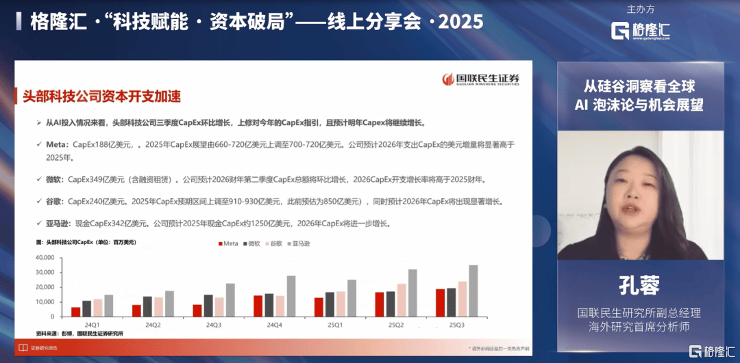 近日,在格隆汇举办的"科技赋能·资本破局"分享会上,国联民生研究所副总经理兼海外研究首席分析师孔蓉围绕 全 球AI发展 趋势、关键技 术演进与市场机会 等进行了深度分享。 她指出,尽管市场近期对AI是否存在泡沫、资本开支是否可持续等问题存在疑虑与分歧,但基于对海外科技前沿与中国AI生态的持续观察, 其 对2026年及之后的AI发展方向保持乐观。 明年AI竞争更卷! 01 AI到底有没有泡沫,明年机会如何?这是过去两个月市场探讨最多的问题。 美股财报季带来的股价回调,让市场对2025—2027年持续加大的资本开支产生疑虑。 孔蓉指出,基于对海外科技前沿与中国AI生态的持续观察,依然看好26年以及后续的AI方向的机会。 今年来,以谷歌Gemini系列为代表的多模态模型取得突破,市场模型持续迭代为市场注入强劲信心。 其中,谷歌凭借其全栈自研能力、长期技术积累与雄厚的资本资源,在长跑中后劲充足。 Meta虽然在2025年经历组织架构与人员调整,市场信心不足,但在资源整合与顶尖AI人才引入后,期待在2026年推出具有竞争力的模型,成 为值得关注的重点。 微软在维持与OpenAI合作的同时,已开始布局自有模型,关注微软后 ...