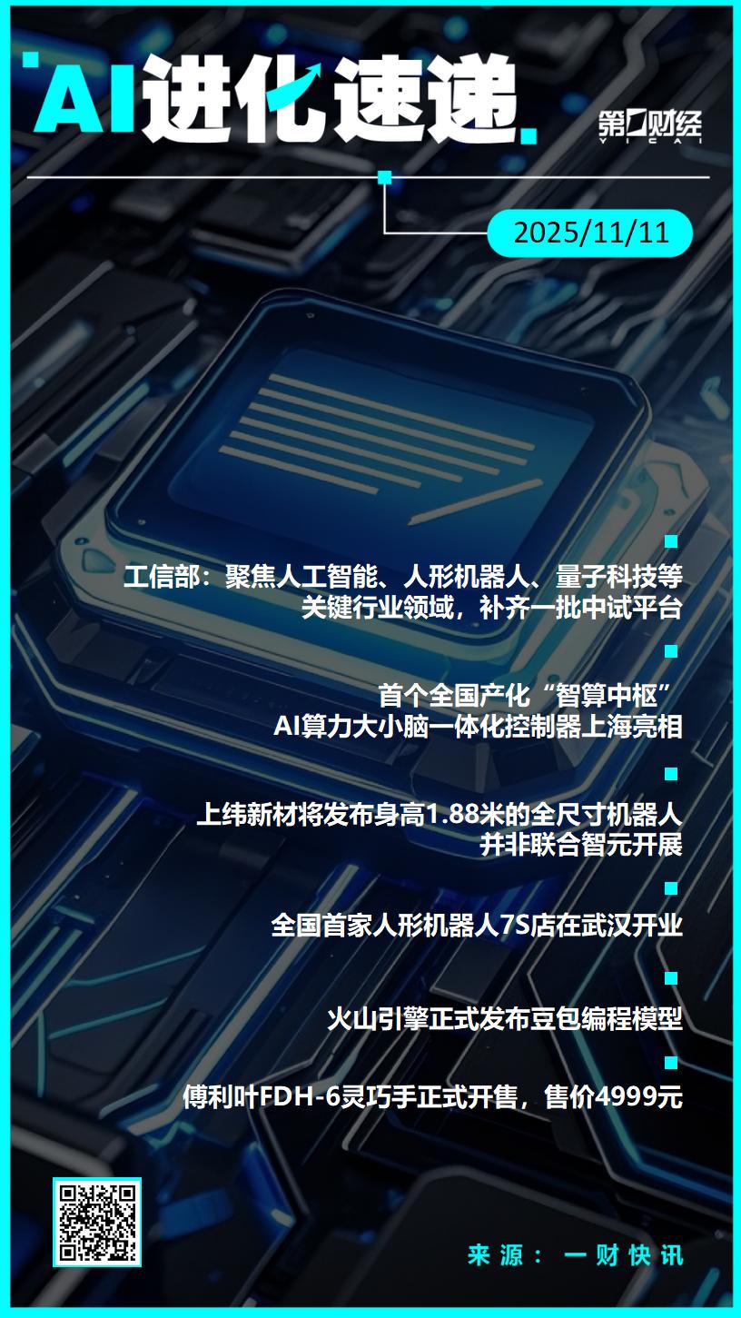 政策支持与产业平台建设 - 工信部聚焦人工智能、人形机器人、量子科技等关键行业领域,计划补齐一批中试平台 [1] - 全国首个人形机器人7S店在武汉开业,标志着人形机器人商业化应用进入新阶段 [1][3] 人工智能与算力基础设施 - 首个全国产化"智算中枢"AI算力大小脑一体化控制器在上海亮相 [1] - 火山引擎正式发布豆包编程模型 [1][3] 人形机器人及核心部件进展 - 上纬新材将发布身高1.88米的全尺寸机器人,该发布并非与联合智元合作开展 [1] - 傅利叶FDH-6灵巧手正式开售,售价为4999元 [1][3]