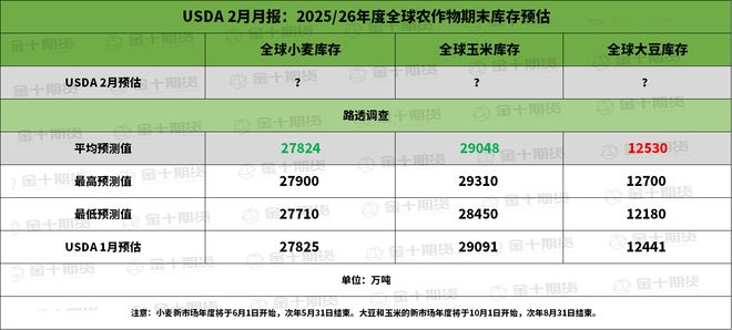 USDA 2月供需报告前瞻 - 报告将于北京时间2月11日凌晨1点公布,核心调整将集中在需求端的压榨和出口,美豆供应数据通常不变 [1] - 市场关注焦点为南美大豆产量调整,尤其是巴西丰产预期与阿根廷干旱影响的博弈 [2][4] 南美大豆产量预期 - **巴西大豆生长形势良好,丰产预期强烈**:多家咨询机构平均预估2025/2026年度巴西大豆产量为1.78亿吨,较上年度增长约4% [2] - 咨询机构AgResource依据初步收获数据,预计巴西大豆单产有望创历史新高,总产量将超过1.84亿吨 [10] - **巴西收割进度快于去年**:截至1月24日,巴西大豆收获进度为6.6%,高于一周前的2.3%和去年同期的3.2%,但略低于五年均值7% [2] - **巴西出口预期强劲**:巴西谷物出口商协会预计2月大豆出口量为1142万吨 [5][8] - **阿根廷大豆面临干旱压力**:自2025年12月以来,阿根廷中部核心产区降水不均遭遇干旱,目前大豆播种已完成98% [4] - 罗萨里奥商品交易所报告显示,有20%的豆田处于干旱状态,65%长势一般,大豆优良率有所下降 [4] - 近期已有机构将阿根廷大豆产量预估下调200万吨至4700万吨,市场担忧产量可能进一步下调 [4] - 阿根廷大豆产量占全球约10%,其豆油、豆粕出口量全球最大,但大豆出口量远少于美国和巴西 [4] 美国大豆供需展望 - **美豆出口面临竞争与不确定性**:1月报告中,2025/2026年度美豆出口已下调146万吨至4286万吨 [3] - 尽管巴西大豆上市带来竞争,但在出口增速未大幅放缓前,预计USDA在2月报告中不会继续下调出口 [3] - 美国农业部出口数据显示,最新一周美豆出口净销售43.69万吨,创市场年度低位,其中对中国大陆净增23.3万吨 [8] - 有期货机构认为,随着中国完成采购承诺,美豆出口销售不佳,出口预估可能在2月报告中继续下调 [6] - **潜在需求支撑**:有消息称中美可能达成额外800万吨美豆采购协议,若落地将对美豆价格形成明显支撑 [5][6][9] 全球及主要国家期末库存前瞻(路透调查均值) - **全球大豆库存**:预计2025/26年度为1.2530亿吨,预估区间1.2180-1.2700亿吨,USDA 1月预估为1.2441亿吨 [11] - **全球玉米库存**:预计为2.9048亿吨,预估区间2.845-2.931亿吨,USDA 1月预估为2.9091亿吨 [11] - **全球小麦库存**:预计为2.7824亿吨,预估区间2.771-2.790亿吨,USDA 1月预估为2.7825亿吨 [11] - **美国大豆库存**:预计2025/26年度为3.47亿蒲式耳,预估区间2.65-3.75亿蒲式耳,USDA 1月预估为3.50亿蒲式耳 [12] - **美国玉米库存**:预计为22.27亿蒲式耳,预估区间21.77-23.15亿蒲式耳,USDA 1月预估为22.27亿蒲式耳 [13] - **美国小麦库存**:预计为9.18亿蒲式耳,预估区间8.79-9.26亿蒲式耳,USDA 1月预估为9.26亿蒲式耳 [13] 南美主要国家产量前瞻(路透调查均值) - **阿根廷大豆产量**:预计2025/26年度为4838万吨,预估区间4700-5050万吨,USDA 1月预估为4850万吨 [15] - **阿根廷玉米产量**:预计为5292万吨,预估区间5150-5500万吨,USDA 1月预估为5300万吨 [14] - **巴西大豆产量**:预计2025/26年度为1.7939亿吨,预估区间1.7800-1.8160亿吨,USDA 1月预估为1.78亿吨 [16] - **巴西玉米产量**:预计为1.3258亿吨,预估区间1.3100-1.3550亿吨,USDA 1月预估为1.31亿吨 [16] 中国市场与价格动态 - **国内豆粕供应充裕**:临近春节,油厂压榨开机率逐步回落,豆粕库存处于93万吨高位,下游饲料集团物理库存约12天 [5][9] - **内外盘走势背离**:美豆价格上涨,但国内连粕涨幅小于外盘,因国内供应充足且巴西升贴水在美豆上涨过程中明显下调 [8][9] - **远期结构承压**:豆粕期货3-5月差和9-1月差连续下跌,市场结构传递出后续基差压力 [9] - **巴西丰产预期限制涨幅**:巴西大豆产量或超过1.8亿吨的预期,限制了美豆价格的上涨空间 [8]