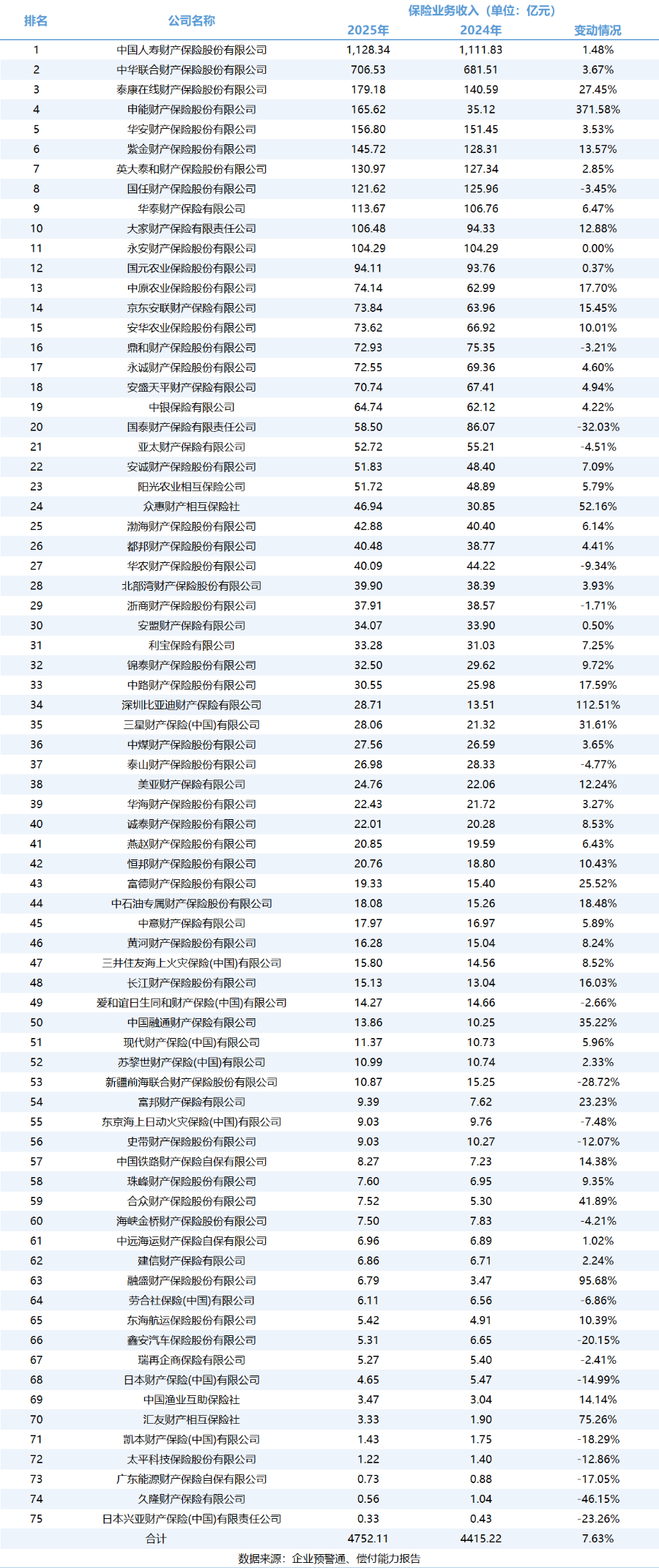 行业整体表现 - 2025年非上市财产险行业整体保费收入稳健增长,已披露数据的75家公司共实现保险业务收入4752.11亿元,同比增长7.63% [1] - 行业盈利能力显著增强,75家公司合计净利润达到146.49亿元,较去年同期大幅增长178.18% [1][7] - 行业竞争格局呈现“强者恒强”态势,头部公司凭借规模与渠道优势在规模与利润上领先,同时中小型险企依托特色业务实现快速增长,差异化经营趋势明显 [1] 保费收入分析 - 头部公司市场份额集中,排名第一的国寿财险实现保险业务收入1128.34亿元,同比增长1.48%,与排名第二的中华联合财险(706.53亿元,同比增长3.67%)合计占统计样本总保费近40% [3][4] - 部分中小型及特色化险企保费增速远超行业平均,其中申能财险保费收入从2024年的35.12亿元增至2025年的165.62亿元,同比激增371.58%;比亚迪财险保费收入从13.51亿元增至28.71亿元,同比增长112.51% [3][6] - 互联网险企泰康在线保费收入179.18亿元,同比增长27.45%,增速显著高于行业平均水平 [3][5] - 部分公司保费出现下滑,如国泰财险同比下降32.03%,新疆前海联合财险同比下降28.72%,国任财险、鼎和财险等也略有下降 [3][6] 盈利能力分析 - 国寿财险以39.76亿元的净利润位居行业首位,同比增长109.04% [8][9] - 多家公司净利润实现数倍乃至数十倍增长,其中泰康在线净利润从0.5亿元增至4.63亿元,增幅达826%;富邦财险净利润从0.05亿元增至1.80亿元,增幅达3500%;国泰财险净利润从0.12亿元增至1.29亿元,增幅达975% [8][10][11] - 行业盈利状况普遍改善,75家公司中有55家净利润较上年改善,其中13家公司成功扭亏为盈,申能财险从2024年亏损24.57亿元转为2025年盈利4.35亿元,比亚迪财险也从亏损1.69亿元转为盈利0.94亿元 [8][11] - 净利润排名前列的公司还包括英大泰和财险(12.13亿元,同比增长38.15%)和中华联合财险(9.90亿元,同比增长4.87%) [8][9] 偿付能力分析 - 行业偿付能力总体保持稳定,绝大部分公司资本充足率远高于监管要求 [12] - 超六成公司2025年综合偿付能力充足率较2024年有所下降,可能受业务扩张、分红或资本市场波动等因素影响 [15] - 部分业务高速增长的公司偿付能力充足率下降明显,例如比亚迪财险综合偿付能力充足率从1173.83%大幅降至589.95%;泰康在线从256.16%降至199.55%;英大泰和从323.05%降至275.82% [13][15] - 偿付能力充足率最高的公司包括日本兴亚财险(1152.78%)、久隆财险(1025.06%)和中国融通财险(1017.84%) [14] - 个别公司偿付能力接近监管红线,新疆前海联合财险2025年四季度综合偿付能力充足率已降至112.87% [16]