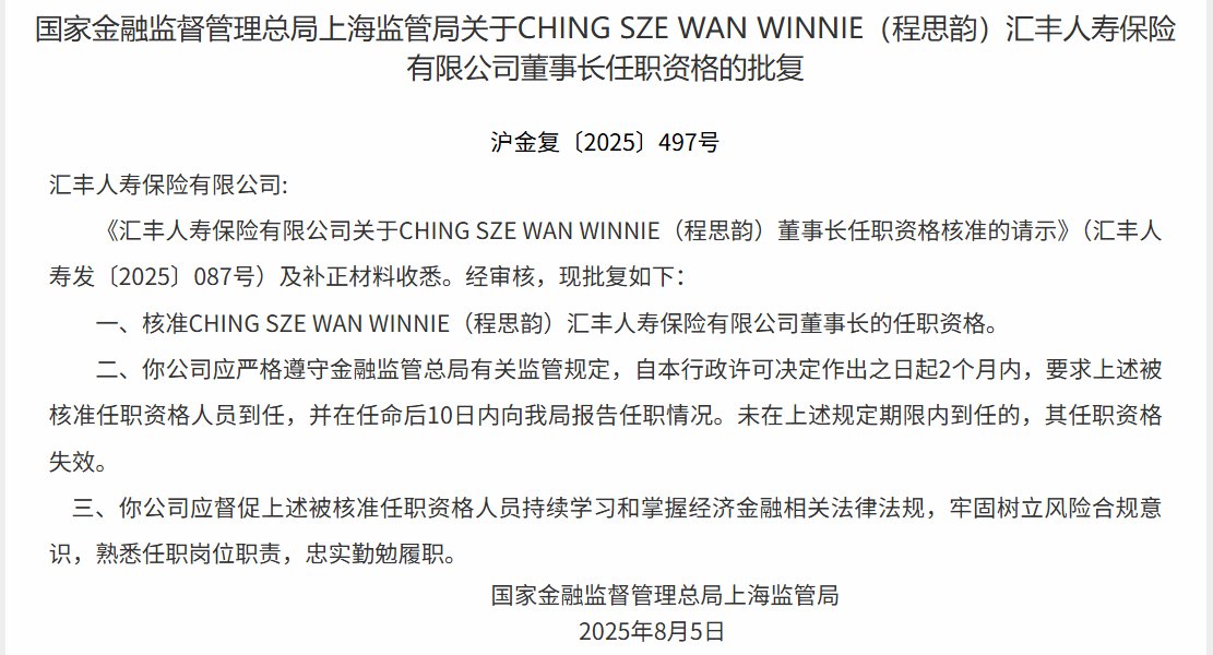 公司人事任命 - 国家金融监督管理总局上海监管局于8月13日核准程思韵担任汇丰人寿保险有限公司董事长 [1] - 程思韵需在行政许可决定作出之日起2个月内到任 并在任命后10日内向上海监管局报告任职情况 [1] - 若未在规定期限内到任 其任职资格将失效 [1] 新任董事长背景 - 程思韵拥有伦敦政治经济学院精算科学学士学位 是英国精算师协会会员 [4] - 其在精算咨询、保险、再保险等行业拥有超过20年的丰富工作经验 [4] - 尤其擅长产品方案设计和风险管理 [4] - 加入汇丰前 曾在瑞士再保险集团工作十余年 期间被派驻香港、新加坡、北京等地并历任重要职务 [4] 公司基本情况 - 汇丰人寿保险有限公司成立于2009年6月 [4] - 公司是一家保险产品和服务提供商 覆盖家庭保障、退休养老、子女教育、财富传承、财富管理和增值等需求 [4] - 该公司由汇丰保险(亚洲)有限公司100%持股 [4]