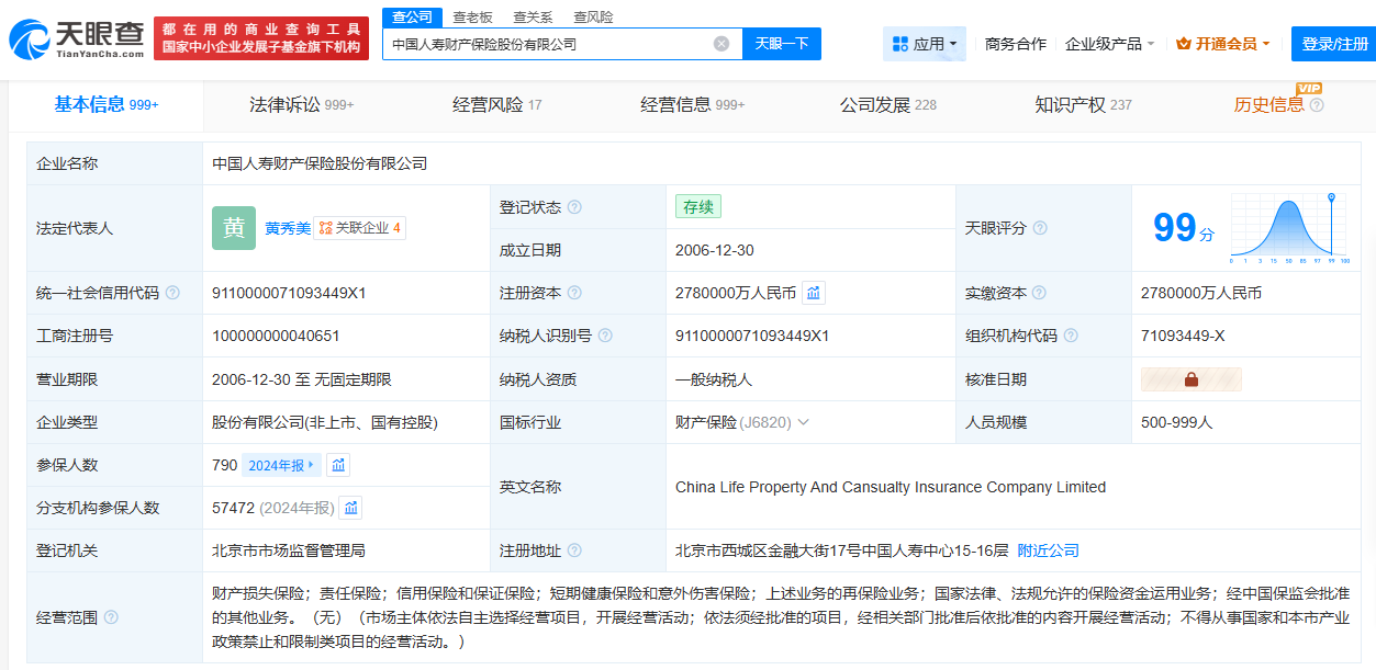 公司基本信息 - 公司名称为中国人寿财产保险股份有限公司,英文名称为China Life Property And Casualty Insurance Company Limited [1] - 公司成立于2006年12月30日,登记状态为存续,营业期限为无固定期限 [1] - 公司法定代表人为黄秀美,企业类型为股份有限公司(非上市、国有控股) [1] - 公司注册地址位于北京市西城区金融大街17号中国人寿中心15-16层,登记机关为北京市市场监督管理局 [1] - 公司统一社会信用代码为9110000071093449X1 [1] 公司资本与股权结构 - 公司注册资本为278亿元人民币,实缴资本为278亿元人民币 [1] - 近期公司完成工商变更,注册资本由188亿元人民币增加至278亿元人民币,增幅约为48% [1] - 公司由中国人寿、国寿寿险共同持股 [1] 公司经营与业务范围 - 公司所属国标行业为财产保险(J6820) [1] - 公司经营范围包括财产损失保险、责任保险、信用保险和保证保险、短期健康保险和意外伤害保险、上述业务的再保险业务以及国家法律、法规允许的保险资金运用业务 [1] - 公司人员规模为500-999人,参保人数为790人(2024年报)[1] - 公司分支机构参保人数为57472人(2024年报)[1] 公司发展动态 - 近期公司发生工商变更,核心变动为注册资本大幅增加 [1] - 此次增资事件的关键词为国寿财险、增资、中国人寿 [2]