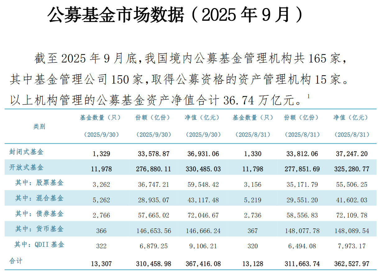 公募基金总规模再创历史新高。10月29日晚,中国证券投资基金业协会发布最新数据显示,截至2025年 9月底,我国境内公募基金管理机构共165家,其中基金管理公司150家,取得公募资格的资产管理机构 15家,这些机构管理的公募基金资产净值合计36.74万亿元。 自今年4月底以来,我国公募基金总规模已连续6个月刷新历史纪录,接连突破33万亿元、34万亿元、35 万亿元和36万亿元关口。整体来看,权益类基金成为推动公募基金总规模持续攀升的重要力量。 权益类规模增长明显 截至今年9月底,开放式基金资产净值合计33.05万亿元,封闭式基金资产净值合计3.69万亿元。其中, 开放式基金数量和规模均较8月底有所增加,数量增加180只、规模增长5204.26亿元,但份额略有减 少;封闭式基金的数量、规模和份额则均较8月底出现一定程度收缩。 开放式基金规模在公募基金总规模中占比约九成。开放式基金涵盖股票基金、混合基金、债券基金、货 币基金和QDII(合格境内机构投资者)基金五大类。截至9月底,上述各类基金规模分别为5.95万亿元、 4.31万亿元、7.20万亿元、14.67万亿元和9106.21亿元。 从上述五类基金的变动情况 ...