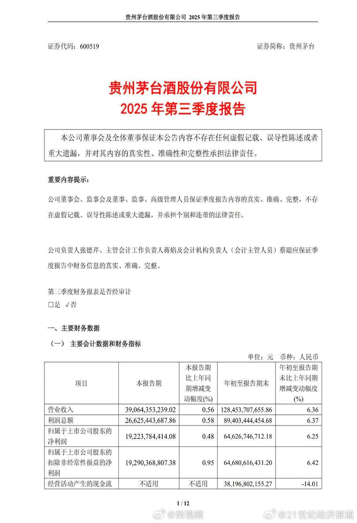 贵州茅台三季度净利润192.24亿元同比微增0.48%