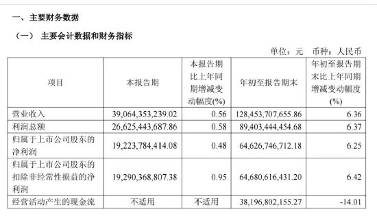 贵州茅台:第三季度净利润192.24亿元,同比增长0.48%