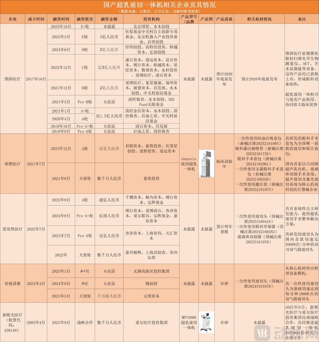 在中国医疗器械版图上,总有一些赛道长期"空白",并非因为市场太小,而是因为"太难"。 过去十年里,中国企业已陆续攻下了眼科手术显微镜、眼底相机、OCT、人工晶状体等多个眼科高端设备,但在这条高门槛技术细分领域里,国产设备仍 未"登顶"。 放眼全球市场,爱尔康、博士伦、蔡司、强生、歌德等国际巨头几乎占据了九成以上的市场份额,其中仅爱尔康一家公司就雄踞了近一半的市场份额。 而在国内,这类国产设备的注册证至今仍是空白。 然而,这个看似"静止"的领域,却在今年突然活跃起来—— 2025年9月,研发出国内首款切速20000次/分钟双刃双气路玻切头的思埃然医疗斩获超亿元A轮融资,资金直指自主超乳玻切一体机的深度研发; 几乎同时,爱尔医疗投资集团斥资数千万元入股新眼光医疗(股票代码:430140),锁定MTP5000超乳玻切一体机的研发注册; 3月,图湃医疗以5亿元E+轮融资登上行业头条,其产品管线同样指向这一赛道; 而在更早的年初,佳视诺德携基础切速10000CPM的双气路玻切头获得无锡高新投控的A+轮融资…… 仅在半年多时间里,已有多起融资事件指向同一赛道。在尚无国产产品获批、融资愈发艰难的当下,国产超乳玻切一体机集体 ...