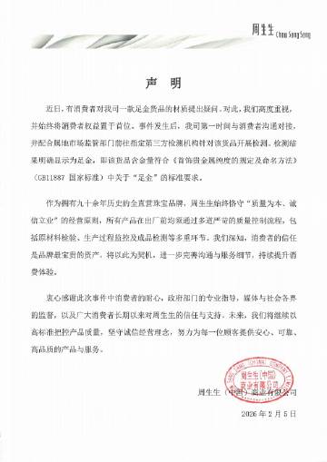 公司声明与事件处理 - 周生生公司于2月5日晚间发布声明,回应消费者对其一款足金货品材质的疑问 [1] - 公司高度重视该事件,并始终将消费者权益置于首位 [1] - 事件发生后,公司第一时间与消费者沟通对接,并配合属地市场监管部门前往指定第三方检测机构进行检测 [1] 产品检测结果与合规性 - 第三方检测机构出具的检测结果明确显示,该货品为足金 [1] - 该货品的含金量符合《首饰贵金属纯度的规定及命名方法》(GB11887国家标准)中关于“足金”的标准要求 [1]
