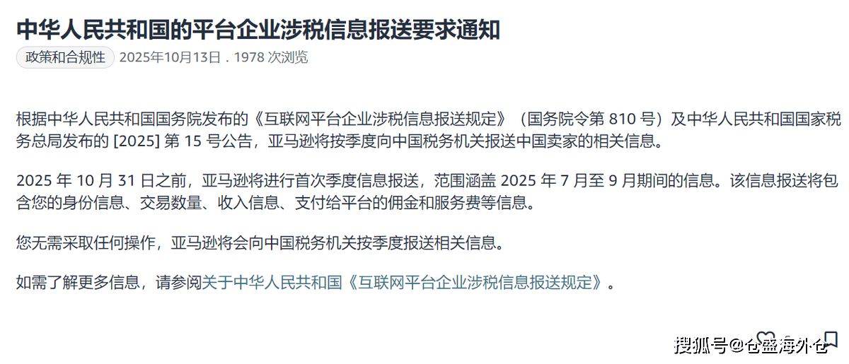 前言:2025年10月,跨境电商行业迎来历史性转折点。亚马逊等主流平台正式启动卖家涉税信息报送机制,标志着中国跨境电商从"无税号不申报"的灰色时 代迈入"数据即合规"的强监管时代。 近日,亚马逊通过卖家后台发布公告,明确将按季度向中国税务机关报送中国卖家的身份信息与交易数据。截至10月中旬,包括亚马逊、沃尔玛、 Shopify、TikTok、TEMU、SHEIN、速卖通、eBay在内的十余家主流跨境电商平台均已完成在税务机关的备案工作。 2025年6月20日,国务院发布《互联网平台企业涉税信息报送规定》(国务院令第810号),首次以法规形式明确互联网平台报送涉税信息的法定义务。 紧随其后,6月26日国家税务总局发布《关于互联网平台企业报送涉税信息有关事项的公告》(2025年第15号),细化了报送范围、时间节点和信息类型等 实操要求。 9月28日,三部门再次联合发布《关于规范互联网平台企业涉税信息报送有关行政处罚事项的公告》(2025年第22号),明确了对违规平台的处罚细则,标 志着监管从"劝诫"转向"亮剑"。 根据国家税务总局电子税务局"全国互联网平台名单信息查询"系统显示,众多跨境电商平台已完成备案。 1. ...