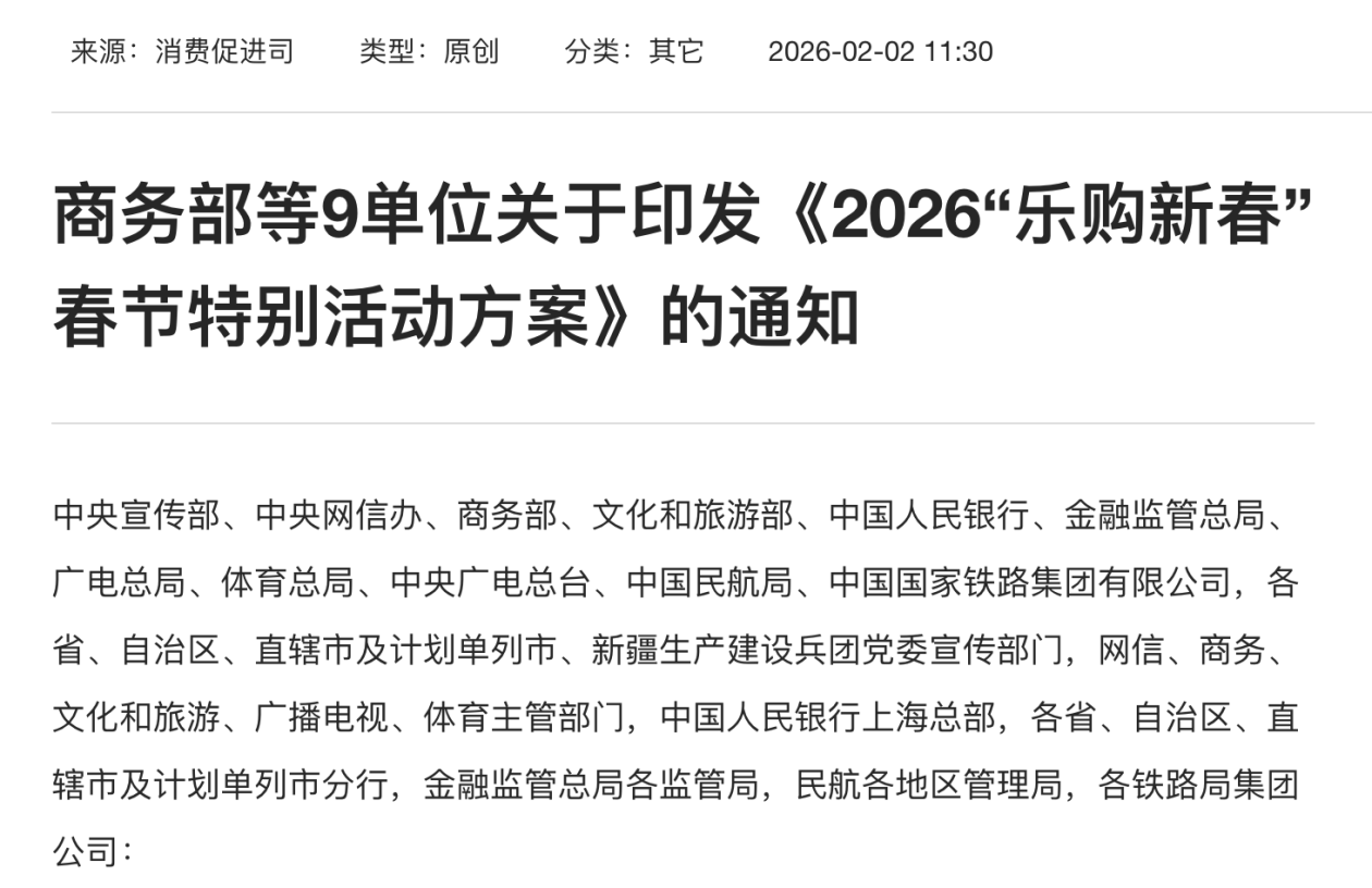 政策支持与资金安排 - 商务部等九部门联合推出覆盖9天春节假期的“乐购新春”特别活动方案 [1] - 各地已安排20.5亿元资金,通过消费券、补贴、红包等形式直接惠及消费者 [1] - 首批用于“以旧换新”的国补资金达625亿元,已到达各地商务部门,春节假期将加大补贴投放 [3] 促消费具体措施 - 第一重礼包聚焦家电、汽车等耐用消费品“以旧换新”,提供补贴支持更新换代 [3] - 第二重礼包为“有奖发票”试点,在50个城市实施,半年内发放100亿元奖补资金,其中春节9天假期奖金规模超10亿元 [3] - 消费者在试点城市取得票面金额100元以上的发票即可参与抽奖 [3] - 第三重礼包为金融机构联合商家推出覆盖机票酒店、餐饮、景点门票等多场景的优惠措施 [3] 金融服务与信贷支持 - 金融机构在节假日保障适量网点营业以满足服务需求 [3] - 金融机构将与重点商户合作推出消费红包、支付满减、积分抵现等活动 [4] - 针对商品消费将加大个人消费贷款投放,支持汽车、家电以旧换新,并利用车险平台促进汽车消费 [4] - 针对数字消费、体验消费等新型消费模式,鼓励金融机构开发适配的金融产品 [4] - 在促进消费的同时将加强金融消费者权益保护,强化信息披露与营销行为规范 [5] 市场保供与价格稳定 - 各地组织重点保供企业加强产销对接,拓宽货源渠道 [6] - 商务部会同财政部在民族地区投放2000吨中央储备冻牛羊肉 [6] - 安徽、福建、山东等地落实猪肉、冬春蔬菜储备10万吨以上 [6] - 上海、湖北启动政府平价肉菜投放,价格优惠超10% [6] - 节前全国生活必需品市场供需两旺价格平稳,重点连锁超市粮油、肉类、鸡蛋库存较上月同期显著增加 [6] 政策影响分析 - 政策组合拳通过625亿元国补和有奖发票直接降低消费者置换成本与消费门槛,旨在激活大宗消费和服务消费潜力 [6] - 金融机构深度参与为消费复苏提供支付便利和信贷支持,注入金融“活水” [6][7] - 充足的物资供应和平稳的价格水平有助于消除居民后顾之忧,进一步释放消费意愿 [7]