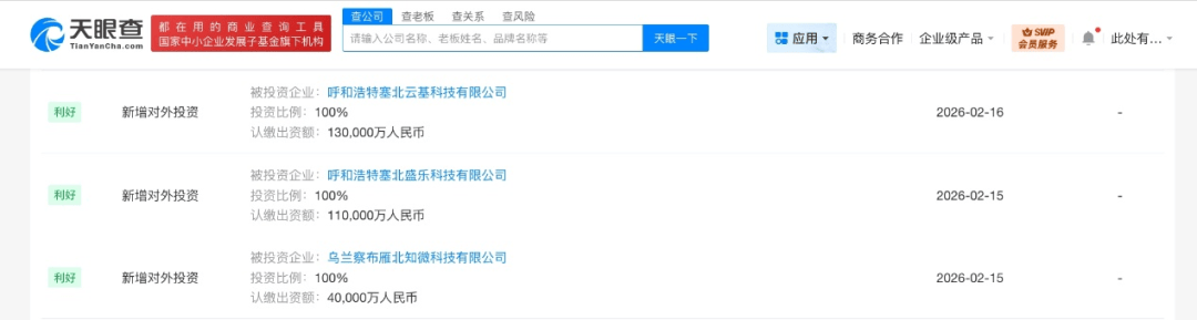 公司设立与股权结构 - 近日,北京字跳网络技术有限公司在内蒙古新设立了三家全资子公司,分别为呼和浩特塞北云基科技有限公司、呼和浩特塞北盛乐科技有限公司和乌兰察布雁北知微科技有限公司 [1] - 三家新公司的法定代表人均为董佳建 [1] - 三家公司的注册资本分别为13亿人民币、11亿人民币和4亿人民币,总计注册资本达28亿人民币 [1] - 股东信息显示,上述三家公司均由北京字跳网络技术有限公司全资持股 [1] 经营范围与业务方向 - 三家公司的经营范围均包含信息技术咨询服务、非居住房地产租赁、软件开发、信息系统集成服务、计算机软硬件及辅助设备零售等 [1] - 公司注册地分别位于呼和浩特市和乌兰察布市,显示出在内蒙古地区的业务布局 [1]