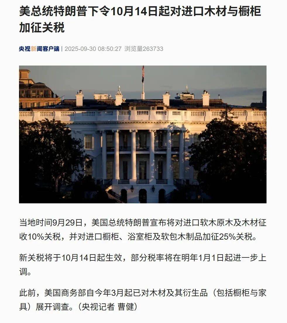 关税突发! 当地时间9月29日,美国总统特朗普宣布将对进口软木原木及木材征收10%关税,并对进口橱柜、浴室 柜及软包木制品加征25%关税。新关税将于10月14日起生效,部分税率将在明年1月1日起进一步上调。 特朗普称,加州州长"软弱无能",遭受的打击尤其严重。为了解决这个"长期存在且永无止境"的问题, 将对所有在美国境外制作的电影征收100%关税。 当地时间5月4日,特朗普就曾在社交媒体上发文表示,他将授权美国商务部和美国贸易代表立即启动程 序,对所有进入美国、在外国制作的电影征收100%关税。此举引发美国电影业内人士和相关专家的担 忧。 此前,9月25日,特朗普曾在其社交媒体"真实社交"宣布,自10月1日起,美国将对多类进口产品实施新 一轮高额关税。措施包括:对厨房橱柜、浴室洗手台及相关建材征收50%关税;对进口家具征收30%关 税;对专利及品牌药品加征100%关税。 美国联邦巡回上诉法院8月29日裁定,特朗普批准对多国征收关税时援引的法律并未赋予其征税权力。 特朗普政府9月3日晚向美国最高法院提交文件,要求尽快推翻这一裁决。美国联邦最高法院此前宣布, 将快速审议特朗普政府征收的多数关税的合法性,定于11月 ...