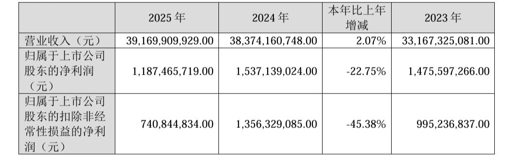 核心观点 - 江铃汽车2025年营业收入实现小幅增长,但净利润出现显著下滑,呈现出“增收不增利”的局面 [1][4] - 公司2025年整车销量增长强劲,但不同车型表现分化,皮卡销量下滑而轻型客车、卡车和SUV销量增长 [3][4] - 公司制定了2026年积极的销量与营收目标,并计划在商用车、乘用车及新能源领域进行产品升级和战略布局 [5] 财务表现 - 2025年营业收入约为391.7亿元,同比增长2.07% [1] - 归属于上市公司股东的净利润约为11.87亿元,同比减少22.75% [2][5] - 归属于上市公司股东的扣除非经常性损益的净利润约为7.41亿元,同比下降45.38% [2][5] - 公司拟向全体股东每10股派发现金红利5.5581元(含税),共计派发现金约4.75亿元(含税) [5] 收入结构 - 整车收入约为359.56亿元,同比增长1.89%,占总营收比重91.8% [2] - 材料及零部件收入约为21.11亿元,同比下滑15.93% [2] - 保养及技术服务等营收约为11.02亿元,同比增长92.25% [2] 产销数据 - 2025年累计销售整车约37.73万辆,较2024年同期上升10.56% [3] - 轻型客车销量约9.98万辆,同比增长14.27% [3][4] - 卡车销量约8.32万辆,同比增长34.35% [3][4] - 皮卡销量约5.97万辆,同比下降18.52% [3][4] - SUV销量约13.46万辆,同比增长13.37% [3][4] - 所有销售均来自境内地区 [4] 2026年经营规划 - 2026年经营目标为销量43万辆,营业收入420亿元 [5] - 在商用车领域,将围绕城市物流等专业场景需求,加快核心产品投放与升级 [5] - 在乘用车领域,将聚焦户外越野等细分需求,推出差异化产品 [5] - 同时加快向新能源转型,持续加大研发投入,推进技术创新和产品创新 [5]