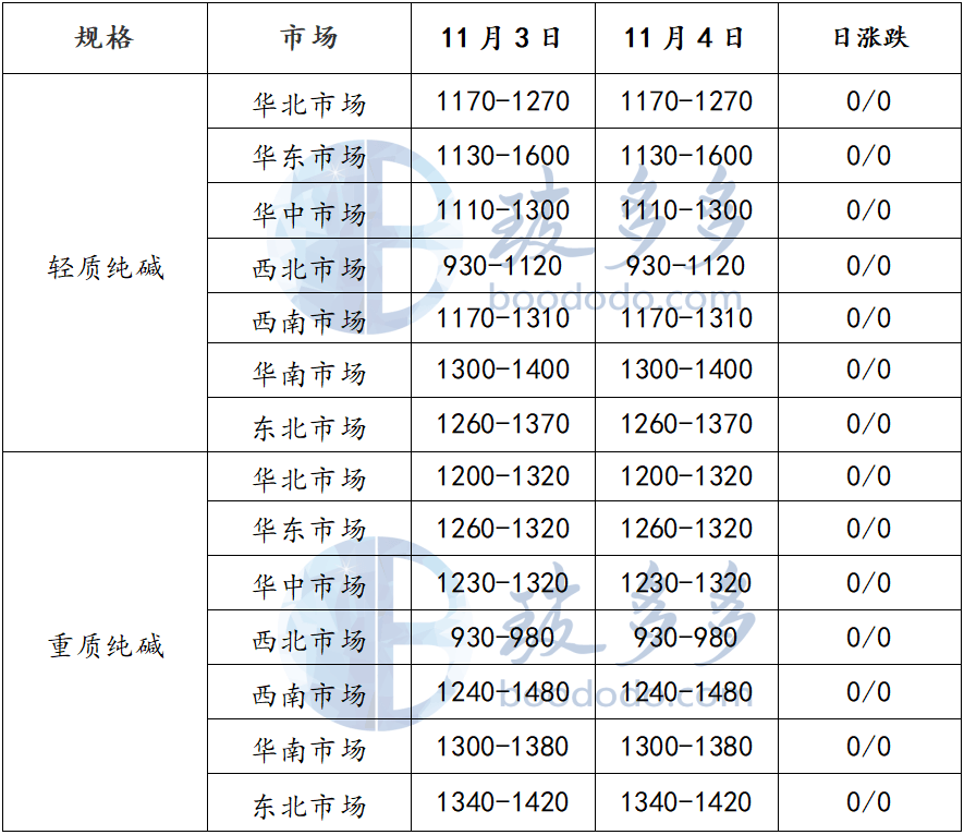 | 规格 | 市场 | 11月3日 | 11月4日 | 日 涨跌 | | --- | --- | --- | --- | --- | | 轻质纯碱 | 华北市场 | 1170-1270 | 1170-1270 | 0/0 | | | 华东市场 | 1130-1600 | 1130-1600 | 0/0 | | | 华中市场 | 1110-1300 | 1110-1300 | 0/0 | | | 西北市场 | 930-1120 | -930-1120 | 0/0 | | | 西南市场 | 1170-1310 | 1170-1310 | 0/0 | | | 华南市场 | 1300-1400 | 1300-1400 | 0/0 | | | 东北市场 | 1260-1370 | 1260-1370 | 0/0 | | 重质纯碱 | 华北市场 | 1200-1320 | 1200-1320 | 0/0 | | | 华东市场 | 1260-1320 | 1260-1320 | 0/0 | | | 华中市场 | 1230-1320 | 1230-1320 | 0/0 | | | 西北市场 | 930-980 | 930-9 ...