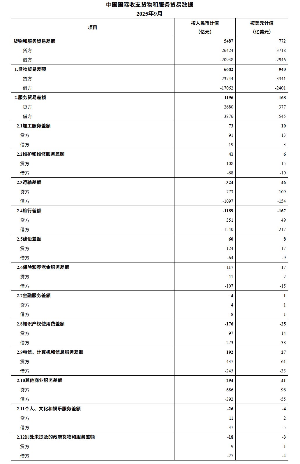 本文编选自"国家外汇管理局"官网,智通财经编辑:蒋远华。 智通财经APP获悉,国家外汇管理局数据显示,2025年9月,我国国际收支货物和服务贸易进出口规模47362亿元,同比增长6%。其中,货物贸易 出口23744亿元,进口17062亿元,顺差6682亿元;服务贸易出口2680亿元,进口3876亿元,逆差1196亿元。服务贸易主要项目为:旅行服务进出 口规模1891亿元,运输服务进出口规模1869亿元,其他商业服务进出口规模1078亿元,电信、计算机和信息服务进出口规模682亿元。按美元计 值,2025年9月,我国国际收支货物和服务贸易出口3718亿美元,进口2946亿美元,顺差772亿美元。 | 2.11个人、文化和娱乐服务差额 | -26 | -4 | | --- | --- | --- | | 贷方 | 11 | 2 | | 借方 | -37 | -5 | | 2.12别处未提及的政府货物和服务差额 | -18 | -3 | | 贷方 | d | 1 | | 借方 | -27 | -4 | ...