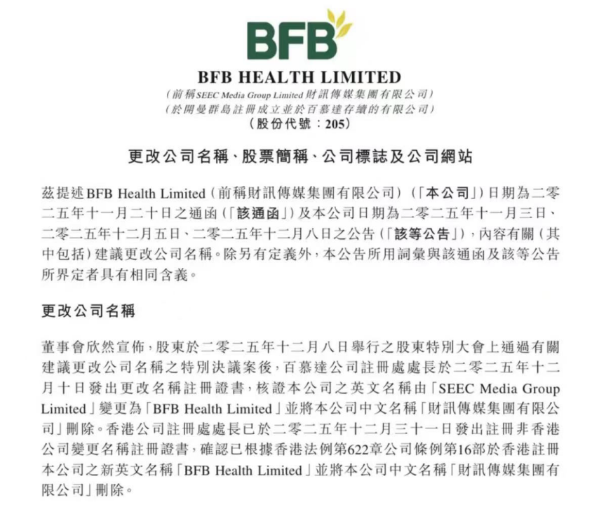 公司更名与市场定位 - 港股上市公司财讯传媒集团有限公司正式更名为“BFB Health Limited”,中文股票简称由“财讯传媒”更改为“BFB HEALTH”,港股代码00205.HK维持不变 [1] - 更名后,公司定位为“中国远程医疗健康管理第一股” [3] - 截至更名当日收盘,公司股价为0.99港元,总市值超过12亿港元 [3] 业务模式与行业地位 - 公司业务模式为构建“线上诊疗+健康管理+产品服务”的闭环模式,契合“互联网+医疗健康”发展路径 [5] - 公司率先实现了远程医疗服务的规模化、规范化运营 [5] - 公司是扎根于安徽亳州的第一家民营企业上市公司,依托当地丰富的中药材资源与完善的健康产业集群,从区域龙头逐步成长为全国性远程医疗服务平台 [3] 融资用途与战略规划 - 公司在二级市场的融资,50%将主要用于大健康产业的AI化升级以及新药研发 [3][5] - 另外50%融资将用于产品迭代、品牌建设以及智能化生产线升级 [3][5]