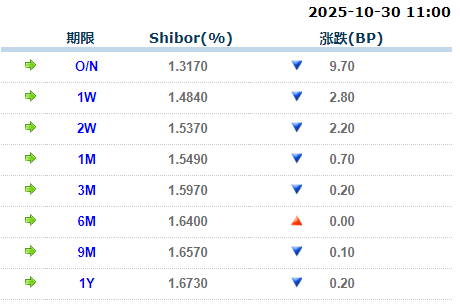 银行间质押式回购市场方面,所有品种均继续下跌,R007与R014依然倒挂,R007成交占比升至16.8%。具体看,DR001、R001加权平均 利率分别下行9.3BP、6.8BP,报1.3115%、1.3688%,成交额分别减少2408亿元、1988亿元;DR007、R007加权平均利率分别下行 4.3BP、3.0BP,报1.5018%、1.5555%,成交额分别增加318亿元、2752亿元;DR014、R014加权平均利率分别下行4.1BP、1.3BP,报 1.5315%、1.5463%,成交额分别增加4亿元、减少83亿元。 货币市场利率(10月30日) 来源:全国银行间同业拆借中心 来源:全国银行间同业拆借中心 新华财经北京10月30日电(高二山)人民银行30日开展3426亿元7天期逆回购操作,操作利率为1.40%,与此前持平;鉴于当日有2125亿 元逆回购到期,公开市场实现净投放1301亿元。 上海银行间同业拆放利率(Shibor)短期品种继续下行,隔夜品种领跌。具体来看,隔夜Shibor下跌9.70BP,报1.3170%;7天Shibor下跌 2.80BP,报1.4840%;14天Shibor下跌2. ...