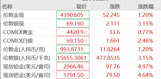 CPO概念表现活跃,长芯博创(300548)涨超13%,逼近历史新高,长光华芯涨超3%,"易中天"光模块三巨头集体上涨。消息面上,据新华社消息,上海 交通大学科研人员近日在新一代光计算芯片领域取得突破,首次实现了支持大规模语义媒体生成模型的全光计算芯片。 贵金属概念股普遍走高。A股贵金属指数涨4%,晓程科技(300139)涨超8%,湖南白银(002716)涨超7%,盛大资源、西部黄金(601069)、紫金矿业 (601899)、中金黄金(600489)等集体走高。消息面上,截至发稿,现货黄金日内涨超1%,突破4390美元关口,再创历史新高。现货白银涨破69美元/ 盎司关口,刷新历史高点,日内涨超3%,年内累涨约1.39倍。 | 名称 | 现价 | 涨跌 | 涨跌幅 | | --- | --- | --- | --- | | 伦敦金现 | 4390.605 | 52.245 | 1.20% | | 伦敦银现 | 69.160 | 2.111 | 3.15% | | COMEX黄金 | 4420.9d | 33.6 | 0.77% | | COMEX白银 | 69.150d | 1.661 | 2.46% | | ...