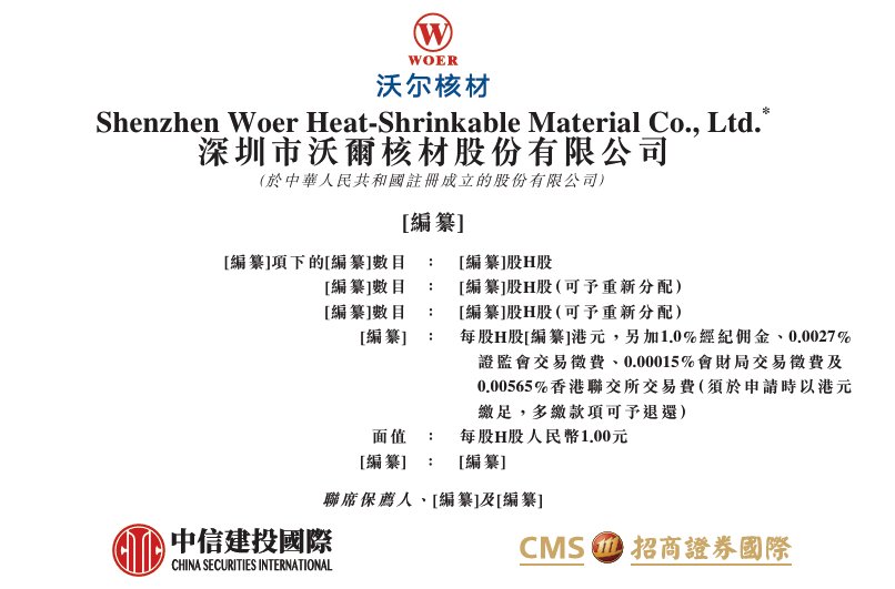 香港交易及結算所有限公司、香港聯合交易所有限公司與證券及期貨事務監察委員會對本 申請版本的內容概不負責,對其準確性或完整性亦不發表任何意見,並明確表示概不就因 本申請版本全部或任何部分內容而產生或因倚賴該等內容而引致的任何損失承擔任何責任。 Shenzhen Woer Heat-Shrinkable Material Co., Ltd.* 深圳市沃爾核材股份有限公司 (「本公司」) 重要提示: 閣下如對本文件的任何內容有任何疑問,應尋求獨立專業意見。 (於中華人民共和國註冊成立的股份有限公司) 的申請版本 警告 本申請版本乃根據香港聯合交易所有限公司(「聯交所」)與證券及期貨事務監察委員 會(「證監會」)的要求而刊發,僅用作向香港公眾人士提供資料。 本申請版本為草擬本,其內所載資料並不完整,亦可能會作出重大變動。 閣下閱 覽本文件,即代表 閣下知悉、接納並向本公司、其聯席保薦人、整體協調人、顧問或包 銷團成員表示同意: 本公司招股章程根據香港法例第32章公司(清盤及雜項條文)條例送呈香港公司註冊 處處長登記前,本公司不會向香港公眾人士提出要約或邀請。倘在適當時候向香港公眾人 士提出要約或邀請,有意投資者務請僅 ...